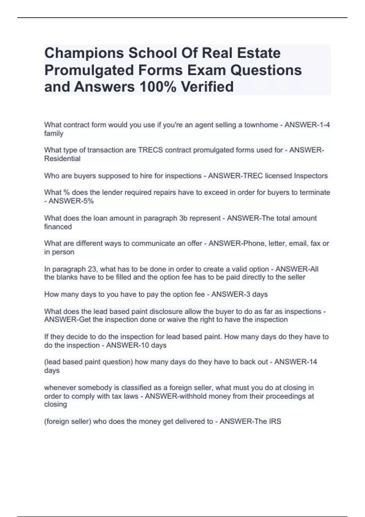 Champions School Of Real Estate Promulgated Forms Exam Questions and Answers 100% Verified Champions School Of Real Estate Promulgated Forms Exam Questions and Answers 100% Verified Champions School Of Real Estate Promulgated Forms Exam Questions and Answers 100% Verified What contract form would you use if you're an agent selling a townhome - ANSWER-1-4 family What type of transaction are TRECS contract promulgated forms used for - ANSWER-Residential Who are buyers supposed to hire for inspections - ANSWER-TREC licensed Inspectors What % does the lender required repairs have to exceed in order for buyers to terminate - ANSWER-5%