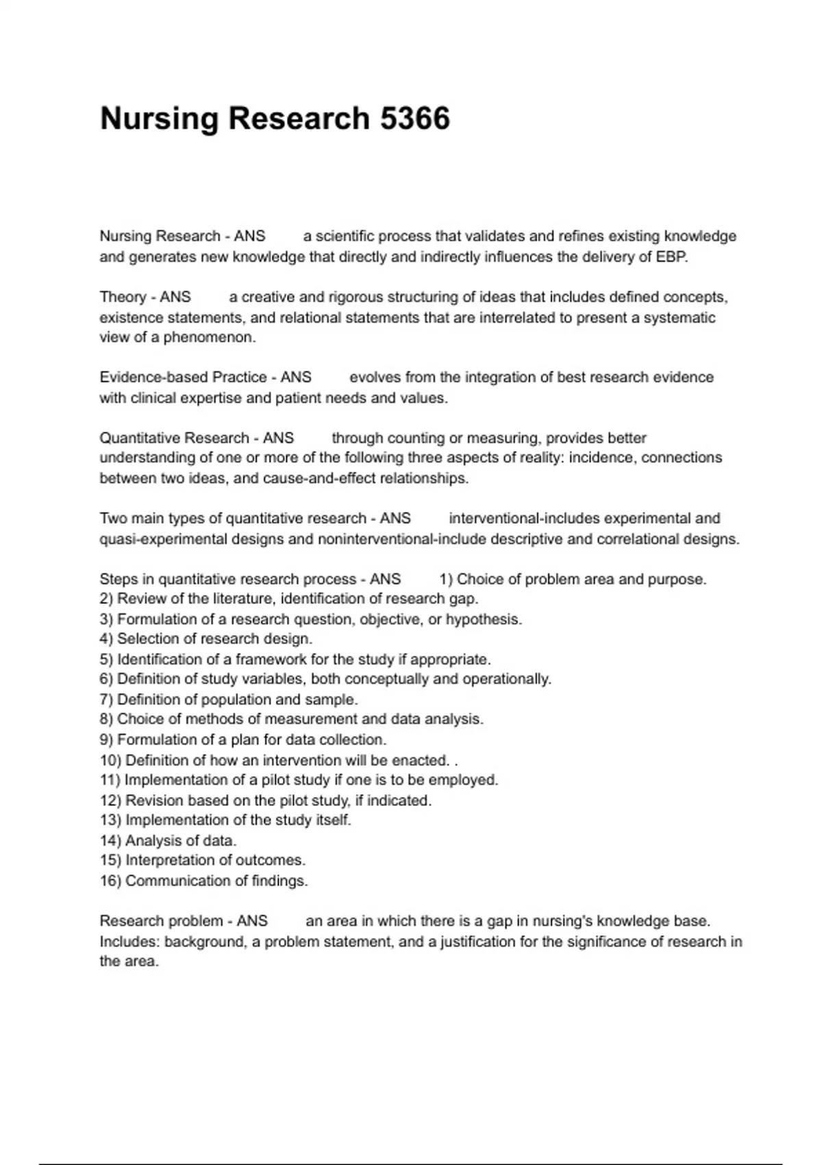 Nursing Research 5366 Nursing Research - ANS a scientific process that validates and refines existing knowledge and generates new knowledge that directly and indirectly influences the delivery of EBP. Theory - ANS a creative and rigorous structuring of ideas that includes defined concepts, existence statements, and relational statements that are interrelated to present a systematic view of a phenomenon. Evidence-based Practice - ANS evolves from the integration of best research evidence with clinical expertise and patient needs and values. Quantitative Research - ANS through counting or measuring, provides better understanding of one or more of the following three aspects of reality: incidence, connections between two ideas, and cause-and-effect relationships. Two main types of quantitative research - ANS interventional-includes experimental and quasi-experimental designs and noninterventional-include descriptive and correlational designs. Steps in quantitative research process - ANS 1) Choice of problem area and purpose. 2) Review of the literature, identification of research gap. 3) Formulation of a research question, objective, or hypothesis. 4) Selection of research design. 5) Identification of a framework for the study if appropriate. 6) Definition of study variables, both conceptually and operationally. 7) Definition of population and sample.