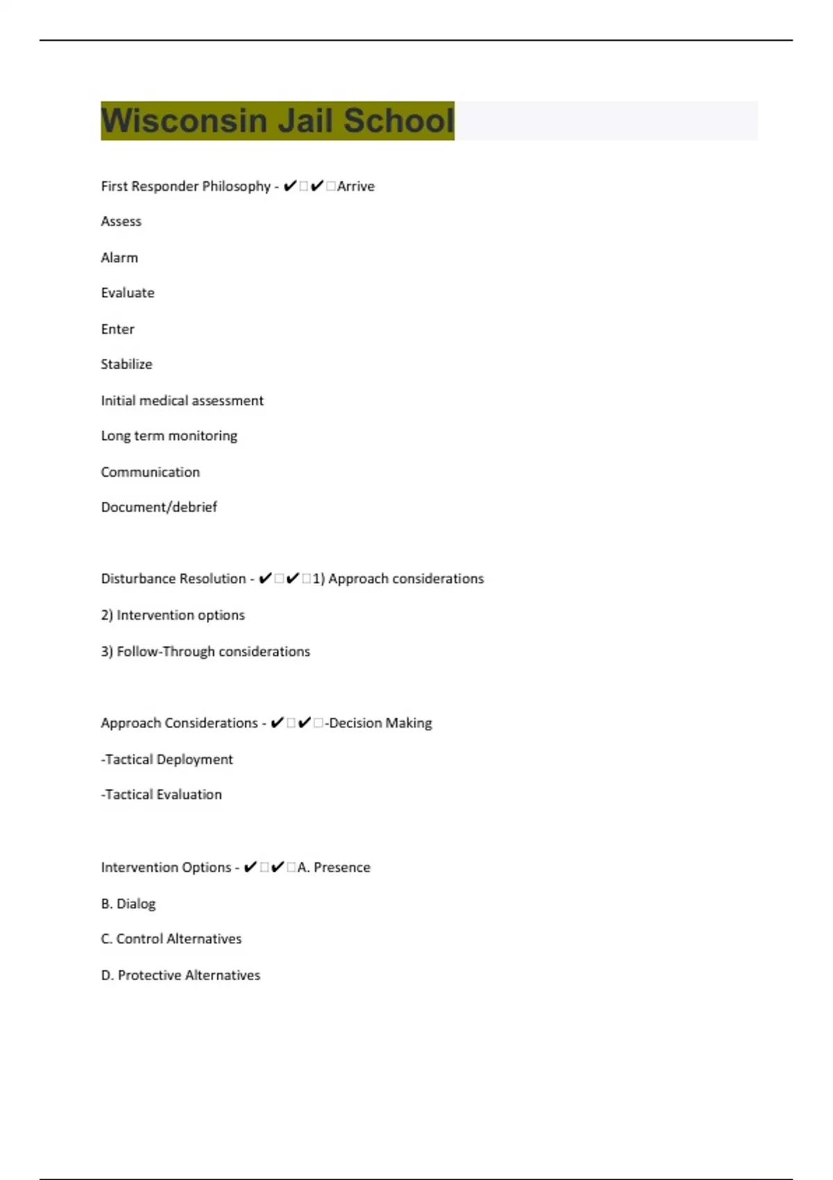 First Responder Philosophy - ️️Arrive Assess Alarm Evaluate Enter Stabilize Initial medical assessment Long term monitoring Communication Document/debrief Disturbance Resolution - ️️1) Approach considerations 2) Intervention options 3) Follow-Through considerations Approach Considerations - ️️-Decision Making -Tactical Deployment -Tactical Evaluation Intervention Options - ️️A. Presence B. Dialog C. Control Alternatives D. Protective Alternatives