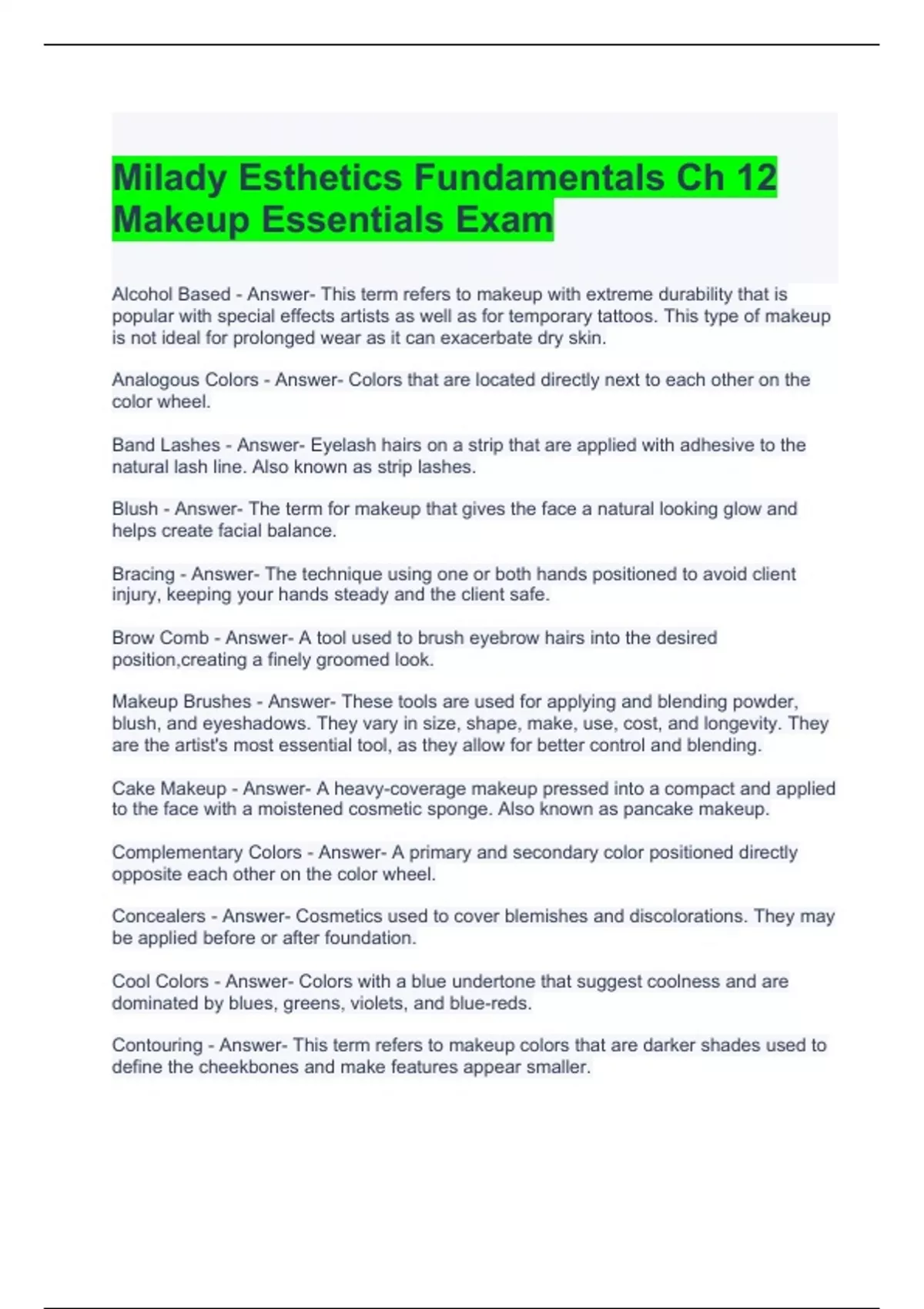Milady Esthetics Fundamentals Ch 12 Makeup Essentials Exam 2024 Questions and Answers