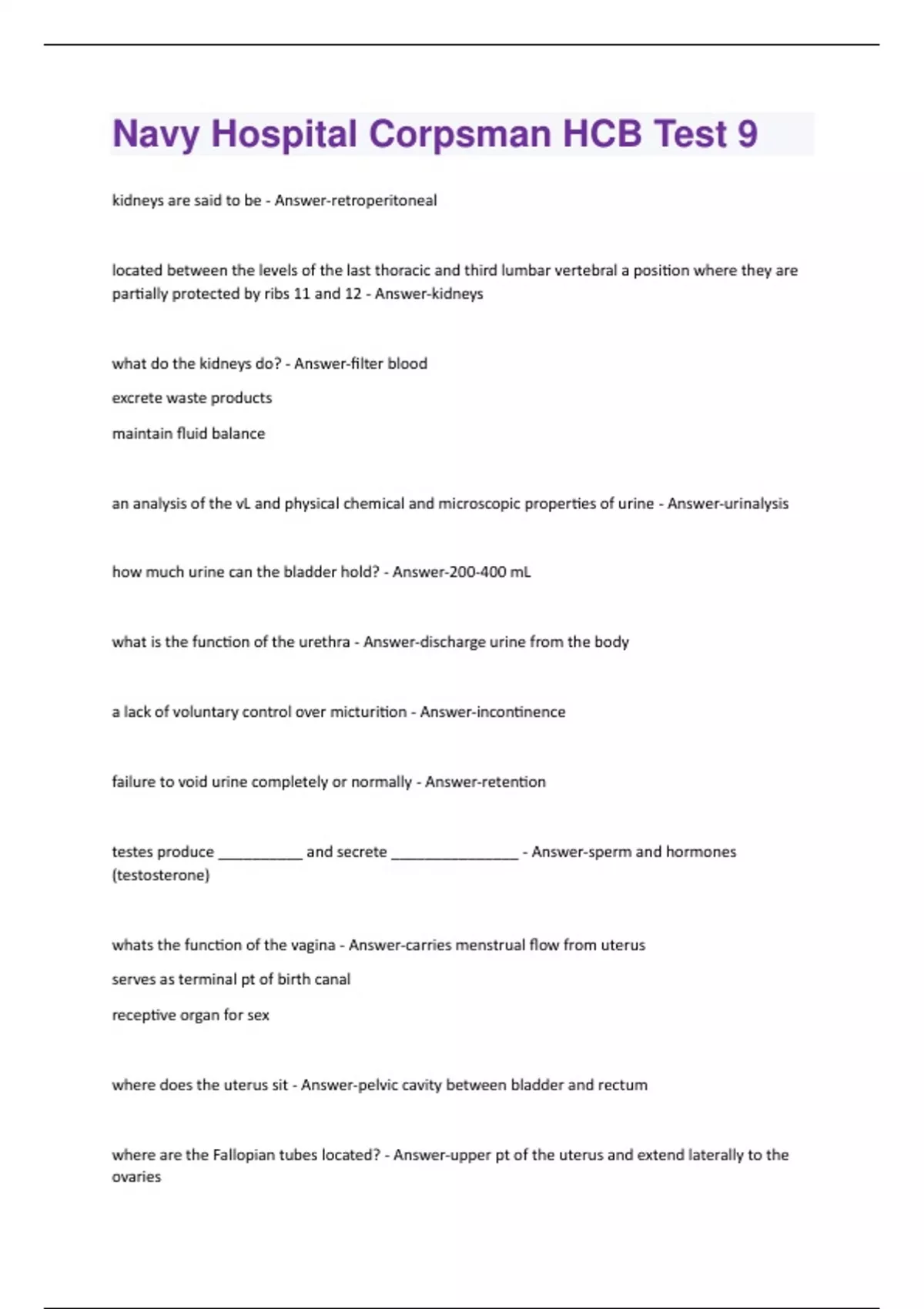 kidneys are said to be - Answer-retroperitoneal located between the levels of the last thoracic and third lumbar vertebral a position where they are partially protected by ribs 11 and 12 - Answer-kidneys what do the kidneys do? - Answer-filter blood excrete waste products maintain fluid balance an analysis of the vL and physical chemical and microscopic properties of urine - Answer-urinalysis how much urine can the bladder hold? - Answer-200-400 mL what is the function of the urethra - Answer-discharge urine from the body a lack of voluntary control over micturition - Answer-incontinence failure to void urine completely or normally - Answer-retention testes produce __________ and secrete _______________ - Answer-sperm and hormones (testosterone) whats the function of the vagina - Answer-carries menstrual flow from uterus serves as terminal pt of birth canal receptive organ for sex where does the uterus sit - Answer-pelvic cavity between bladder and rectum where are the Fallopian tubes located? - Answer-upper pt of the uterus and extend laterally to the ovarieswhat do the ovaries secrete? - Answer-estrogen and progesterone what the the functions of estrogen and progesterone - Answer-controlling menstrual cycle supporting pregnancy a bacterial infection of the lower urinary tract, more common in females - Answer-urinary tract infection whats the plan for a UTI - Answer-urinalysis admin antibiotics pt edu. about hydration and hygiene an acute infection of the kidneys (upper urinary tract infection) - Answer-pyelonephritis what can you do to test for pyelonephritis - Answer-costovertebral angle tenderness whats the plan for pyelonephritis - Answer-urinalysis admin antibiotics admin IV fluids stones formed in the pelvis of the kidney which obstruct urinary tract - Answer-renal calculi (kidney stone) marked by severe cramping flank pain with nausea and vomiting - Answer-renal colic whats the plan for renal calculi - Answer-urinalysis admin pain meds x ray/ct scan admin IV fluids diet changespregnancy occurring outside the uterus, most commonly in the Fallopian tube, but can occur elsewhere - Answer-ectopic pregnancy whats the plan for ectopic pregnancy - Answer-blood draw admin meds possible surgery an infection of a woman's reproductive organs uterus, usually happens when a STI, like gonorrhea or chlamydia, isn't treated quickly - Answer-pelvic inflammatory disease