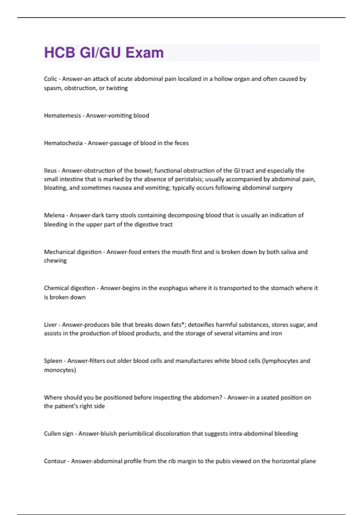 Colic - Answer-an attack of acute abdominal pain localized in a hollow organ and often caused by spasm, obstruction, or twisting Hematemesis - Answer-vomiting blood Hematochezia - Answer-passage of blood in the feces Ileus - Answer-obstruction of the bowel; functional obstruction of the GI tract and especially the small intestine that is marked by the absence of peristalsis; usually accompanied by abdominal pain, bloating, and sometimes nausea and vomiting; typically occurs following abdominal surgery Melena - Answer-dark tarry stools containing decomposing blood that is usually an indication of bleeding in the upper part of the digestive tract Mechanical digestion - Answer-food enters the mouth first and is broken down by both saliva and chewing Chemical digestion - Answer-begins in the esophagus where it is transported to the stomach where it is broken down Liver - Answer-produces bile that breaks down fats*; detoxifies harmful substances, stores sugar, and assists in the production of blood products, and the storage of several vitamins and iron Spleen - Answer-filters out older blood cells and manufactures white blood cells (lymphocytes and monocytes) Where should you be positioned before inspecting the abdomen? - Answer-in a seated position on the patient's right side Cullen sign - Answer-bluish periumbilical discoloration that suggests intra-abdominal bleeding Contour - Answer-abdominal profile from the rib margin to the pubis viewed on the horizontal planeMcBurney's point - Answer-above the appendix; located one third of the distance from the iliac crest to the umbilicus What does vomiting of frank blood or "coffee-grounds" vomit indicate? - Answer-bleeding from an upper GI source How do you treat patients with significant upper/lower GI bleeding? - Answer-two 18 gauge or larger intravenous lines External hemorrhoids - Answer-distal to the dentate line; painful; covered by non-keratinized stratified squamous epithelium How is a nasogastric tube held in place? - Answer-tape to the patient's cheek or nose (not introduced surgically) Jejunum tube (j-tube) - Answer-most frequently used feeding tube; must be surgically added Gastrostomy tube (g-tube) - Answer-feeding tube surgically implanted through the abdominal wall and into stomach; secured with balloon. Cholecystitis - Answer-severe and sometimes sudden right upper quadrant and/or epigastric (upper central abdomen just below the xiphoid process) pain, which may radiate to the shoulder; often radiates to the back; is often confused with chest pain and may be difficult to distinguish from cardiac complaints What position will help maintain the airway? - Answer-left laterally recumbent position