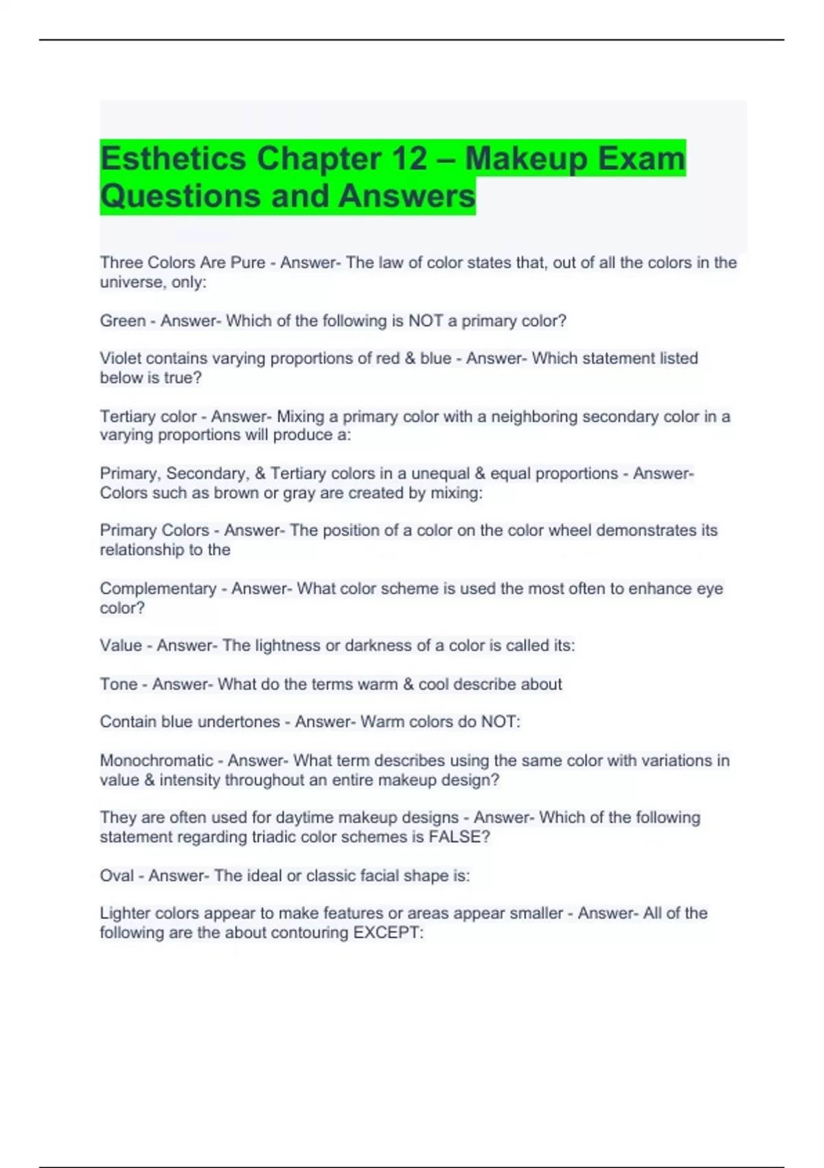 Esthetics Chapter 12 – Makeup Exam Questions and Answers 2024
