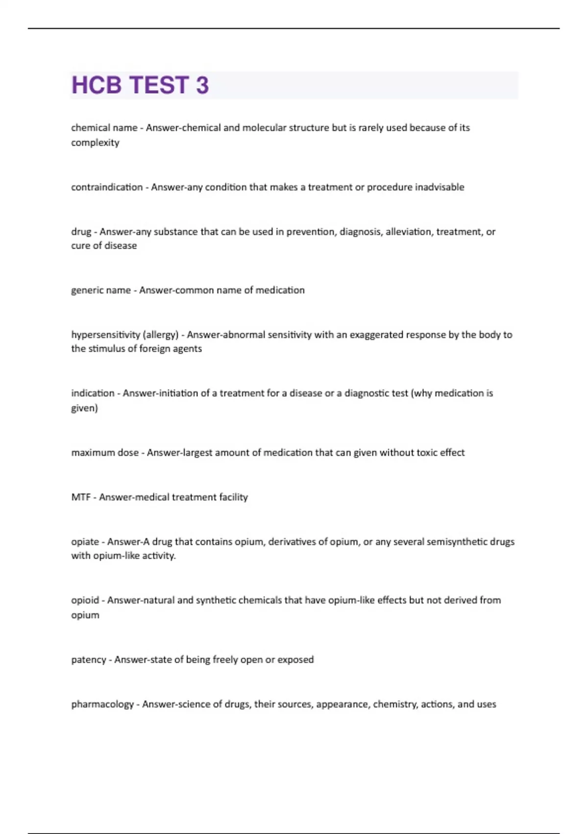 hemical name - Answer-chemical and molecular structure but is rarely used because of its complexity contraindication - Answer-any condition that makes a treatment or procedure inadvisable drug - Answer-any substance that can be used in prevention, diagnosis, alleviation, treatment, or cure of disease generic name - Answer-common name of medication hypersensitivity (allergy) - Answer-abnormal sensitivity with an exaggerated response by the body to the stimulus of foreign agents indication - Answer-initiation of a treatment for a disease or a diagnostic test (why medication is given) maximum dose - Answer-largest amount of medication that can given without toxic effect MTF - Answer-medical treatment facility opiate - Answer-A drug that contains opium, derivatives of opium, or any several semisynthetic drugs with opium-like activity. opioid - Answer-natural and synthetic chemicals that have opium-like effects but not derived from opium patency - Answer-state of being freely open or exposed pharmacology - Answer-science of drugs, their sources, appearance, chemistry, actions, and usespharmacy - Answer-branch of pharmacology dealing with preparation, dispensing, and proper use of medications physician's desk reference - Answer-comprehensive book listing of drug products for medical professionals therapeutics - Answer-science of treating disease by any method that will relieve pain, treat or cure diseases and infections, or prolong life toxicology - Answer-study of poisons, their actions, detection, and treatment of the conditions produced by them trade/brand name - Answer-name given by manufacturer usual/therapeutic dose - Answer-normal adult dose, usual dose, or average dose, amount needed to produce the desired therapeutic effect the physician's desk reference has how many sections? - Answer-5 (pink, blue, yellow, white, and final) pink section - Answer-Comprehensive alphabetic listing of brand name products and a list of manufacturers with their product blue section - Answer-therapeutic index yellow section - Answer-a drug, chemical, and pharmacological index to drugs white section - Answer-A list of the major products of manufacturers with information on composition, action, uses, administration, dosage, precautions, contraindications, and supply of each drug. final section - Answer-Contains full size color photographs to aid in medication identification antacid - Answer-action: counteract hyperacidity in the stomach/used for heartburn and indigestionside effects: constipation, arrhythmias (IV only) administered: oral or parenteral generic/trade names: Calcium Carbonate (Tums) and Ranitidine (Zantac) antiflatulants - Answer-action: acts on the surface of bubbles by reducing surface tension breaking the bubble/used for excess gas in the intestinal tract Side effects: bloating, constipation, diarrhea administered: oral generic/trade names: simethicone (Gas-x or Mylicon) antibiotics - Answer-action: kills or inhibits the growth of other microorganisms/used for bacterial infections side effects: mild to severe allergic reaction, nausea, diarrhea administered: oral, parenteral, or topical divided into: penicillin, cephalosporins, fluoroquinolones, tetracycline's, macrolides, and sulfnamides generic/trade names: Penicillin (Pen-V-K), Cephalexin (Keflex), and Azithromycin (Zithromax)