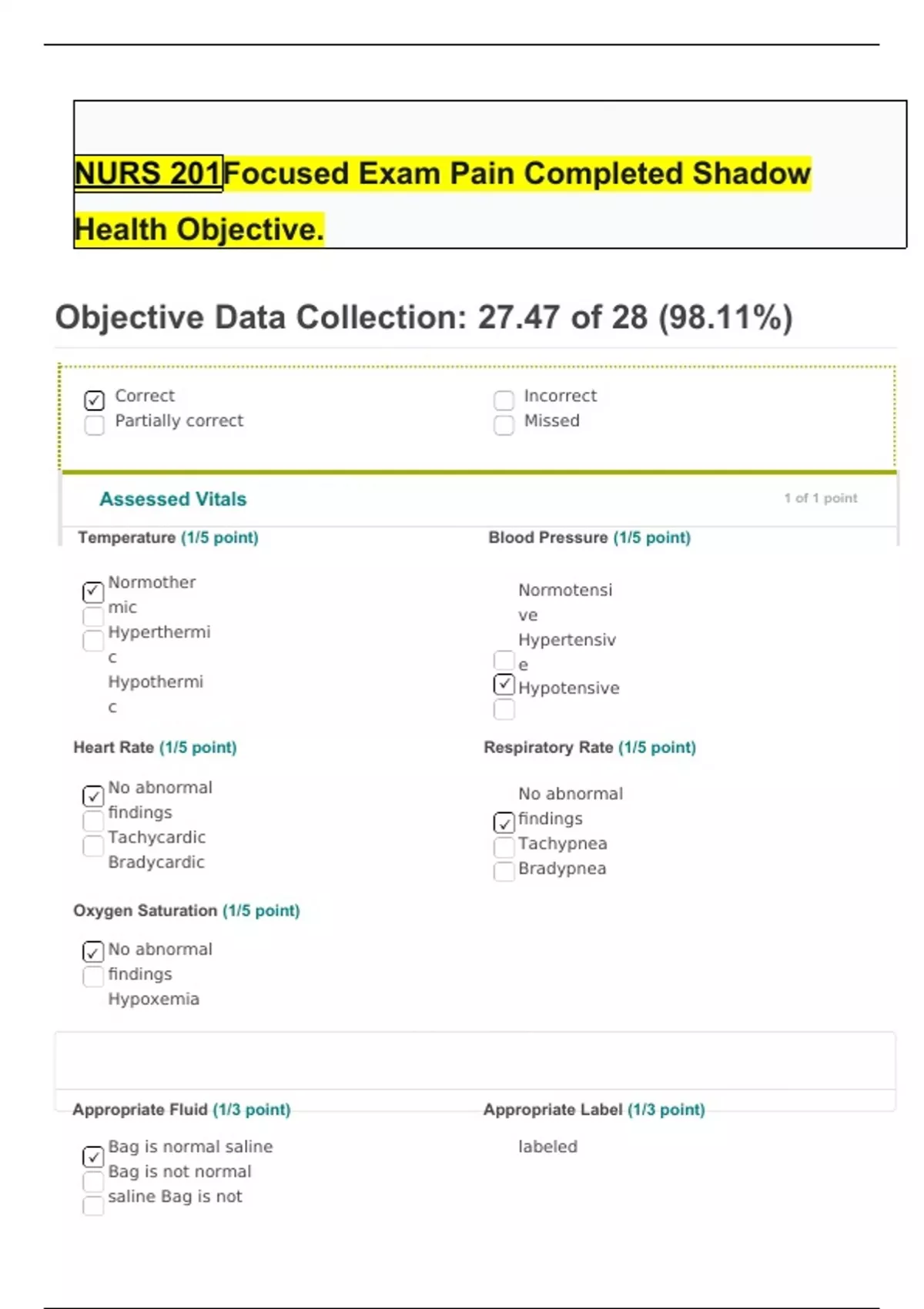 NURS 201Focused Exam Pain Completed Shadow Health Objective. Objective Data Collection: 27.47 of 28 (98.11%) Correct Incorrect Partially correct Missed Assessed Vitals 1 of 1 point Temperature (1/5 point) Blood Pressure (1/5 point) Normothermic Hyperthermic Hypothermic Normotensive Hypertensive Hypotensive Heart Rate (1/5 point) Respiratory Rate (1/5 point) No abnormal findings Tachycardic Bradycardic No abnormal findings Tachypnea Bradypnea Oxygen Saturation (1/5 point) No abnormal findings Hypoxemia Bag is normal saline Bag is not normal saline Bag is not labeled Name and dosage are correct Name is incorrect Dosage is incorrect Infuse rate is incorrect Bag is not labeled Fluid Appearance (1/3 point) No visible abnormal appearance Cloudy Inappropriate color Crystallization IV pump is infusing IV fluid at the ordered rate IV pump is infusing IV fluid at a slower than the ordered rate IV pump is infusing IV fluid at a faster than the ordered rate No visible abnormal signs Erytherma Infiltration Dry and intact Moist dressing Symmetric Asymmetric Symmetric Asymmetric Appearance (1/3 point) No visible abnormal findings Rash Papules, pustules, or comedones Skin growths (freckles, moles, or birth mark) Excessive hair growth Evidence of skin trauma (scar, laceration, or bruising) Drooping eye Drooping mouth No visible abnormal findings Ptosis Swelling Lesion Allergic shiners No visible abnormal findings Sclera - injection Sclera - icterus Lens opacification Pupillary Reaction (1/3 point) No visible abnormal findings (PERRL) Unequal Irregular Miosis