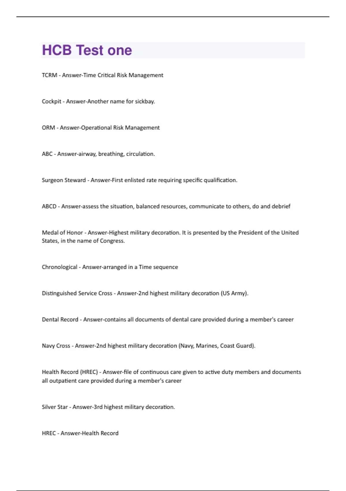 TCRM - Answer-Time Critical Risk Management Cockpit - Answer-Another name for sickbay. ORM - Answer-Operational Risk Management ABC - Answer-airway, breathing, circulation. Surgeon Steward - Answer-First enlisted rate requiring specific qualification. ABCD - Answer-assess the situation, balanced resources, communicate to others, do and debrief Medal of Honor - Answer-Highest military decoration. It is presented by the President of the United States, in the name of Congress. Chronological - Answer-arranged in a Time sequence Distinguished Service Cross - Answer-2nd highest military decoration (US Army). Dental Record - Answer-contains all documents of dental care provided during a member's career Navy Cross - Answer-2nd highest military decoration (Navy, Marines, Coast Guard). Health Record (HREC) - Answer-file of continuous care given to active duty members and documents all outpatient care provided during a member's career Silver Star - Answer-3rd highest military decoration. HREC - Answer-Health RecordBronze Star - Answer-A U.S. military decoration awarded after 06DEC1941 for heroic or meritorious achievement or service in combat not involving aerial flight. Inpatient Record (IREC) - Answer-a medical file that documents care provided to a patient assigned to a designated inpatient bed at an MTF or ship Communication - Answer-A highly complicated interpersonal process of people relating to each other through conversation, gestures, appearance, behavior, writing, and, at times, even silence. IREC - Answer-Inpatient Record Customer - Answer-someone who buys goods or services from businesses, or a person who has a particular quality OREC - Answer-Outpatient Record Client - Answer-anyone for whom a service requiring some degree of confidentiality is provided. Outpatient Record (OREC) - Answer-A file of continuous care which documents ambulatory treatment received by a person other than an active duty member Active Listening - Answer-listening carefully to what they are saying and ask questions to get to the root of their requests. health information portability and accountability act - Answer-provides safeguards for protected health information (PHI) to ensure patient privacy is maintained Contact Point - Answer-the physical location to which a customer goes to obtain a service. Privacy Act of 1974 - AnswerCaduceus - Answer-Rating insignia fur the Hospilal CorpsSickbay - Answer-Where sick and injured men were taken for care. Attitude - Answer-the tendency to move toward a situation or away from it