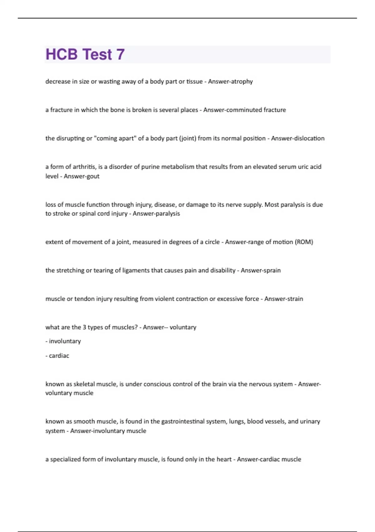 decrease in size or wasting away of a body part or tissue - Answer-atrophy a fracture in which the bone is broken is several places - Answer-comminuted fracture the disrupting or "coming apart" of a body part (joint) from its normal position - Answer-dislocation a form of arthritis, is a disorder of purine metabolism that results from an elevated serum uric acid level - Answer-gout loss of muscle function through injury, disease, or damage to its nerve supply. Most paralysis is due to stroke or spinal cord injury - Answer-paralysis extent of movement of a joint, measured in degrees of a circle - Answer-range of motion (ROM) the stretching or tearing of ligaments that causes pain and disability - Answer-sprain muscle or tendon injury resulting from violent contraction or excessive force - Answer-strain what are the 3 types of muscles? - Answer-- voluntary - involuntary - cardiac known as skeletal muscle, is under conscious control of the brain via the nervous system - Answervoluntary muscle known as smooth muscle, is found in the gastrointestinal system, lungs, blood vessels, and urinary system - Answer-involuntary muscle a specialized form of involuntary muscle, is found only in the heart - Answer-cardiac muscleHow many vertebrae are there? - Answer-33 vertebrae the vertebrae are divided into how many sections? - Answer-5 sections - cervical (7) - thoracic (12) - lumbar (5) - sacral (5) - coccyx (4) what are the 5 main functions of the musculoskeletal system? - Answer-- provide support - protect internal organs - provides leverage and movement - produce blood cells - store minerals and lipids shoulder dislocation MOI/NOI - Answer-- caused by pressure or force pushing the bone out of the joint; usually occurs in the setting of acute trauma - the shoulder is a very dynamic point, prone to injury - anterior dislocations are most common shoulder dislocation Signs/Symptoms - Answer-- severe pain in the affected shoulder - repeat injury shoulder dislocation objective date - Answer-- deformity and inability to use extremity or joint as usual - anterior dislocation (shoulder is squared off) - prominent acromion process - arm is held in slight abduction and external rotation shoulder dislocation assessment - Answer-- fracture of the humeral head - acromioclavicular joint injury - scapular fracture- cervical spine injury shoulder dislocation plan/treatment - Answer-PRE HOS - splint utilizing sling and swathe In/Outpatient - administer pain meds - reduction of dislocation - obtain imagery (X-ray, CT, MRI) - document encounter