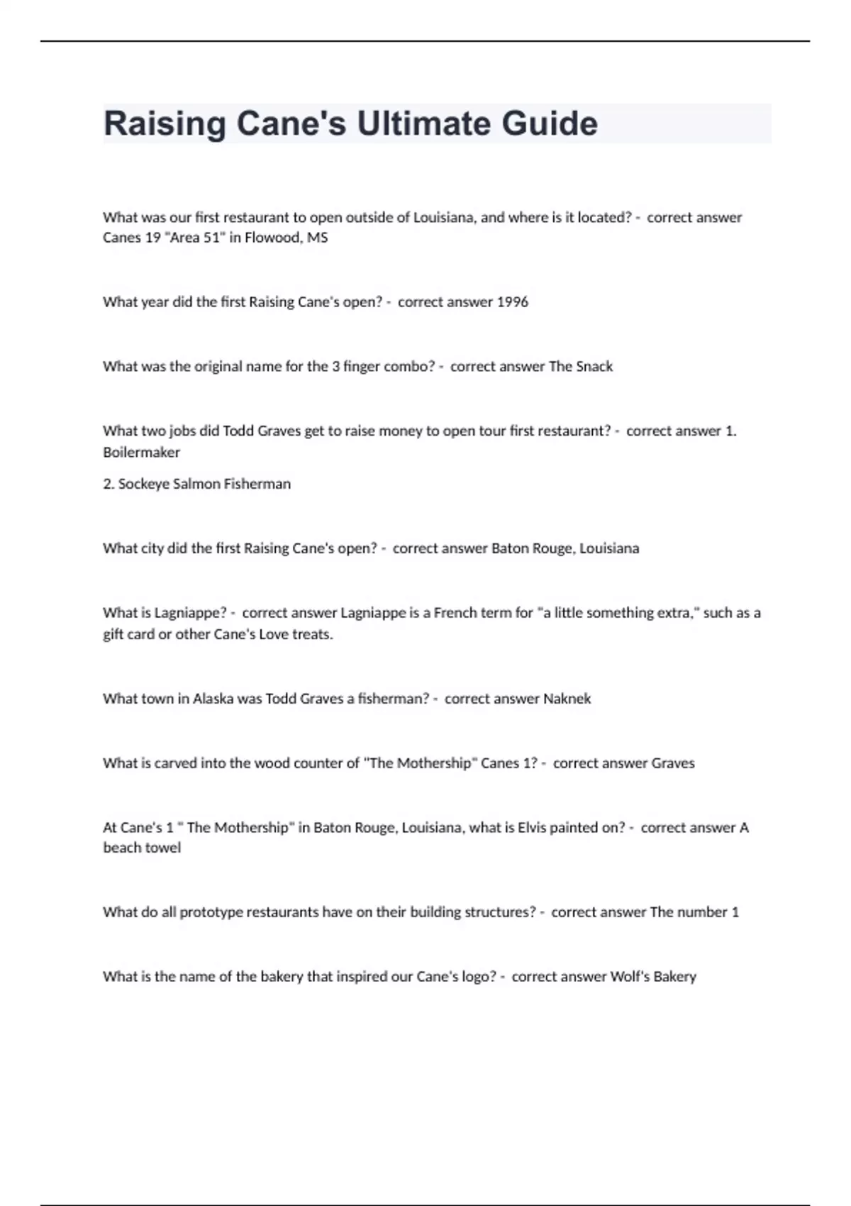 Raising Cane's Ultimate GuideWhat was our first restaurant to open outside of Louisiana, and where is it located? - correct answer Canes 19 "Area 51" in Flowood, MS What year did the first Raising Cane's open? - correct answer 1996 What was the original name for the 3 finger combo? - correct answer The Snack What two jobs did Todd Graves get to raise money to open tour first restaurant? - correct answer 1. Boilermaker 2. Sockeye Salmon Fisherman What city did the first Raising Cane's open? - correct answer Baton Rouge, Louisiana What is Lagniappe? - correct answer Lagniappe is a French term for "a little something extra," such as a gift card or other Cane's Love treats. What town in Alaska was Todd Graves a fisherman? - correct answer Naknek What is carved into the wood counter of "The Mothership" Canes 1? - correct answer Graves At Cane's 1 " The Mothership" in Baton Rouge, Louisiana, what is Elvis painted on? - correct answer A beach towel What do all prototype restaurants have on their building structures? - correct answer The number 1 What is the name of the bakery that inspired our Cane's logo? - correct answer Wolf's Bakery