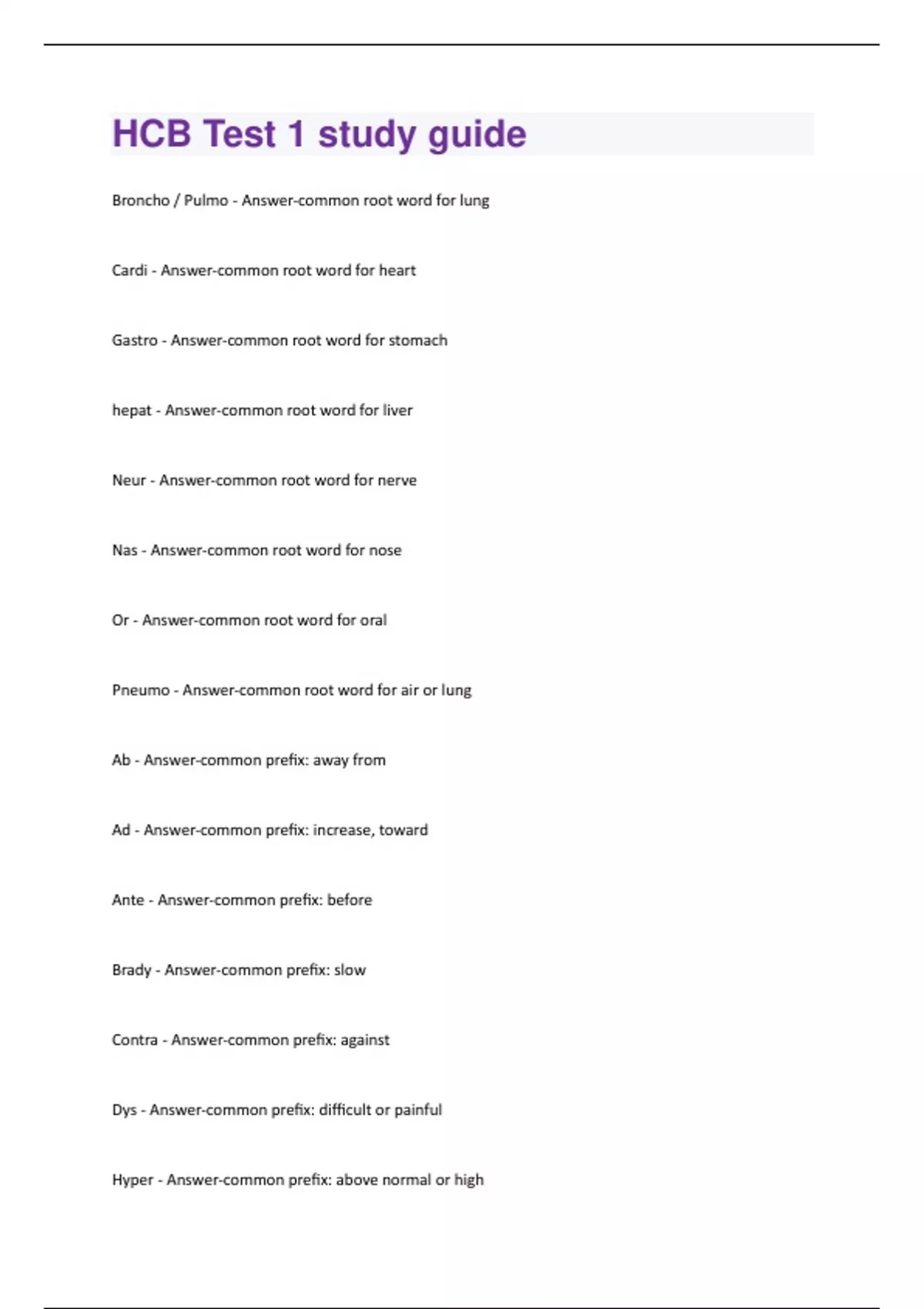Broncho / Pulmo - Answer-common root word for lung Cardi - Answer-common root word for heart Gastro - Answer-common root word for stomach hepat - Answer-common root word for liver Neur - Answer-common root word for nerve Nas - Answer-common root word for nose Or - Answer-common root word for oral Pneumo - Answer-common root word for air or lung Ab - Answer-common prefix: away from Ad - Answer-common prefix: increase, toward Ante - Answer-common prefix: before Brady - Answer-common prefix: slow Contra - Answer-common prefix: against Dys - Answer-common prefix: difficult or painful Hyper - Answer-common prefix: above normal or highHypo - Answer-common prefix: below normal or low Inter - Answer-common prefix: between Peri - Answer-common prefix: around Poly - Answer-common prefix: many Post - Answer-common prefix: after Pre - Answer-common prefix: before Super/supra - Answer-common prefix: above or in excess Sym / Syn - Answer-common prefix: joined together Tachy - Answer-common prefix: fast Uni - Answer-common prefix: one Algia - Answer-common suffix: pain Al - Answer-common suffix: pertaining to emesis - Answer-common suffix: vomiting itis - Answer-common suffix: inflammation olgy - Answer-common suffix: study ofplegia - Answer-common suffix: paralysis pnea - Answer-common suffix: breathing
