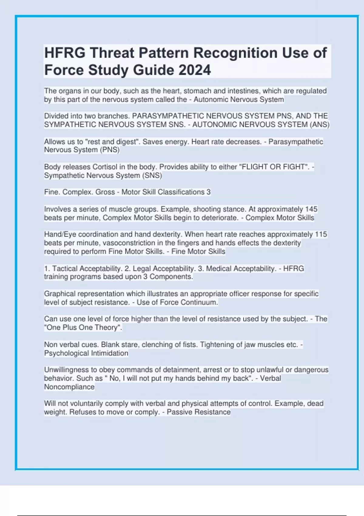The organs in our body, such as the heart, stomach and intestines, which are regulated by this part of the nervous system called the - Autonomic Nervous System Divided into two branches. PARASYMPATHETIC NERVOUS SYSTEM PNS, AND THE SYMPATHETIC NERVOUS SYSTEM SNS. - AUTONOMIC NERVOUS SYSTEM (ANS) Allows us to "rest and digest". Saves energy. Heart rate decreases. - Parasympathetic Nervous System (PNS) Body releases Cortisol in the body. Provides ability to either "FLIGHT OR FIGHT". - Sympathetic Nervous System (SNS) Fine. Complex. Gross - Motor Skill Classifications 3 Involves a series of muscle groups. Example, shooting stance. At approximately 145 beats per minute, Complex Motor Skills begin to deteriorate. - Complex Motor Skills Hand/Eye coordination and hand dexterity. When heart rate reaches approximately 115 beats per minute, vasoconstriction in the fingers and hands effects the dexterity required to perform Fine Motor Skills. - Fine Motor Skills 1. Tactical Acceptability. 2. Legal Acceptability. 3. Medical Acceptability. - HFRG training programs based upon 3 Components. Graphical representation which illustrates an appropriate officer response for specific level of subject resistance. - Use of Force Continuum. Can use one level of force higher than the level of resistance used by the subject. - The "One Plus One Theory". Non verbal cues. Blank stare, clenching of fists. Tightening of jaw muscles etc. - Psychological Intimidation Unwillingness to obey commands of detainment, arrest or to stop unlawful or dangerous behavior. Such as " No, I will not put my hands behind my back". - Verbal Noncompliance Will not voluntarily comply with verbal and physical attempts of control. Example, dead weight. Refuses to move or comply. - Passive Resistance
