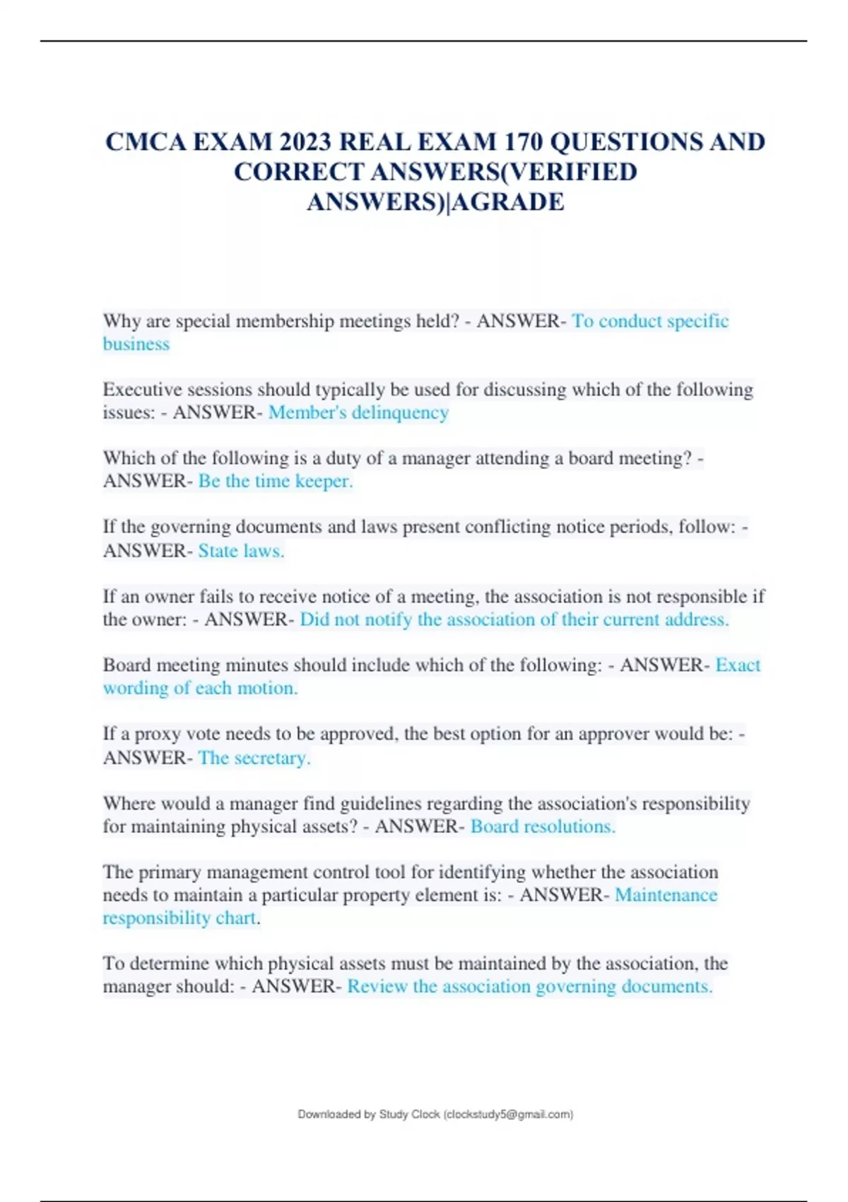 Why are special membership meetings held? - ANSWER- To conduct specific business Executive sessions should typically be used for discussing which of the following issues: - ANSWER- Member's delinquency Which of the following is a duty of a manager attending a board meeting? - ANSWER- Be the time keeper. If the governing documents and laws present conflicting notice periods, follow: - ANSWER- State laws. If an owner fails to receive notice of a meeting, the association is not responsible if the owner: - ANSWER- Did not notify the association of their current address. Board meeting minutes should include which of the following: - ANSWER- Exact wording of each motion. If a proxy vote needs to be approved, the best option for an approver would be: - ANSWER- The secretary. Where would a manager find guidelines regarding the association's responsibility for maintaining physical assets? - ANSWER- Board resolutions. The primary management control tool for identifying whether the association needs to maintain a particular property element is: - ANSWER- Maintenance responsibility chart. To determine which physical assets must be maintained by the association, the manager should: - ANSWER- Review the association governing documents. Downloaded by Study Clock () lOMoARcPSD| Which of the following is a common management control for ensuring maintenance work is performed in a timely manner? - ANSWER- A work order/response form. When monitoring maintenance of an association's swimming pool, which of the following should be entered into a permanent log at regular intervals? - ANSWERChlorine level readings. Which of the following is an example of an association control system? - ANSWER- Frequent neighborhood inspections. A work order: - ANSWER- Assigns maintenance tasks. Which type of maintenance should be managed with a routine maintenance contract? - ANSWER- Cutting the grass Which method is the best alternative to increasing assessments? - ANSWERIncreasing income by charging higher user fees. When the Board reviews the proposed budget for approval, what should it consider? - ANSWER- The financial position of the association. What is the primary source of requirements when developing the association's annual maintenance budget? - ANSWER- Governing documents. When an association contracts out all of its service and has no employees, it is a best business practice to: - ANSW