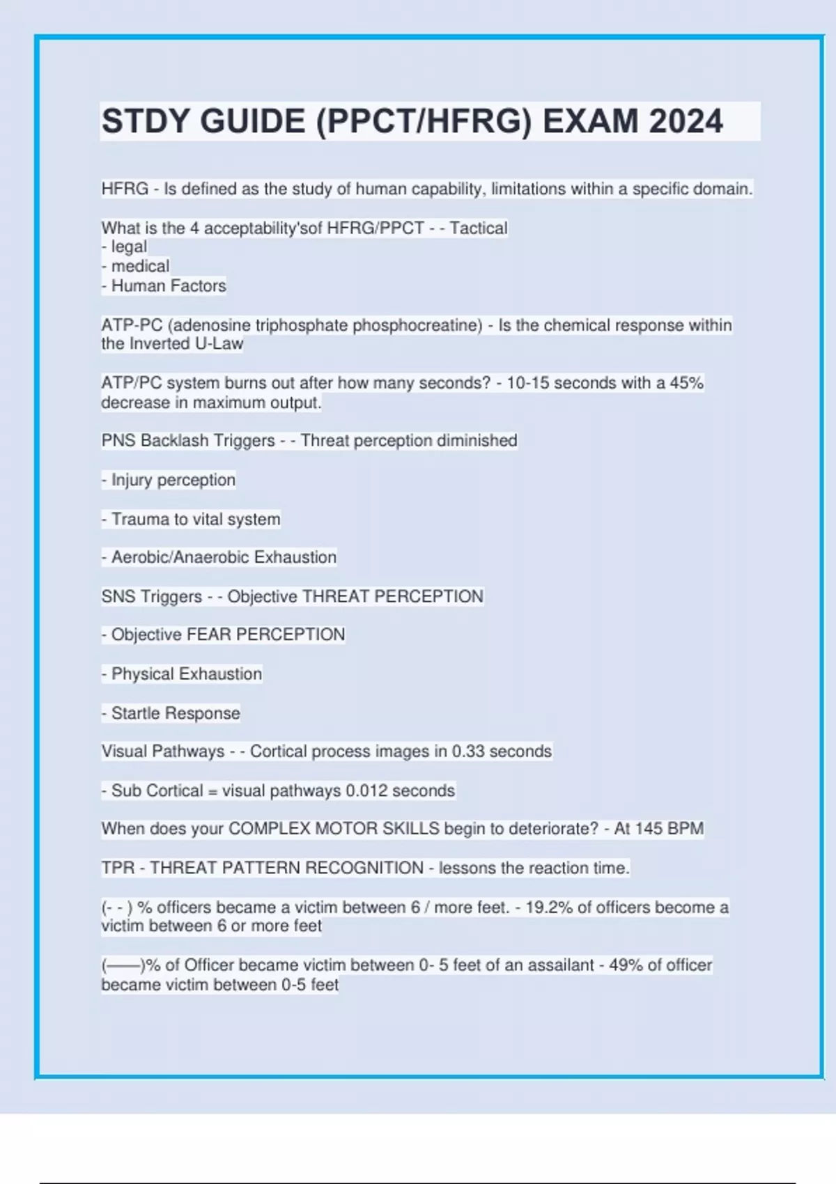 HFRG - Is defined as the study of human capability, limitations within a specific domain. What is the 4 acceptability'sof HFRG/PPCT - - Tactical - legal - medical - Human Factors ATP-PC (adenosine triphosphate phosphocreatine) - Is the chemical response within the Inverted U-Law ATP/PC system burns out after how many seconds? - 10-15 seconds with a 45% decrease in maximum output. PNS Backlash Triggers - - Threat perception diminished - Injury perception - Trauma to vital system - Aerobic/Anaerobic Exhaustion SNS Triggers - - Objective THREAT PERCEPTION - Objective FEAR PERCEPTION - Physical Exhaustion - Startle Response Visual Pathways - - Cortical process images in 0.33 seconds - Sub Cortical = visual pathways 0.012 seconds When does your COMPLEX MOTOR SKILLS begin to deteriorate? - At 145 BPM TPR - THREAT PATTERN RECOGNITION - lessons the reaction time. (- - ) % officers became a victim between 6 / more feet. - 19.2% of officers become a victim between 6 or more feet (——)% of Officer became victim between 0- 5 feet of an assailant - 49% of officer became victim between 0-5 feet ( - - ) % of Victims of officers were ambushed - 20-30% ANS (Autonomic Nervous System) - Has 2 branches - SNS (Sympathetic Nervous System) fight / flight - PNS (Parasympathetic Nervous System) Rest Motor Initiation - - Analyze - Formulate a Strategy - Reaction PNS - Back Lash (Manage) - Lying Horizontally will equalize BP and or ingest fast burning Carbs as soon as possible. HFRG Assailant Speed of attack is... (- -) seconds - 0.370 seconds PPCT - Reaction Time - - Reaction Time - Movement Time - Response Time HUMAN PROCESSING - (3 Categories) - - Conscious (10%) - Subconscious ((50-60%) - Unconscious (30-40%) Motor Skills Classification - - Fine - Complex - Gross Combat performance variables - - Mindset - Nutrition/ Hydration - Fitness HFRG Definition of Pain Compliance? - The use of the stimulus pain to control resistive behavior. HFRG definition of Stunning is? - The stimulation of overwhelming sensory input that is sudden, intense and unexpected. HFRG Distraction Techniques definition is? - The use of control techniques that weaken motor action by changing the thought process. Average length is about 3 seconds HFRG definition of Motor Dysfunction? - A control striking technique that overstimulates nerves, resulting in a temporary muscle impairment.
