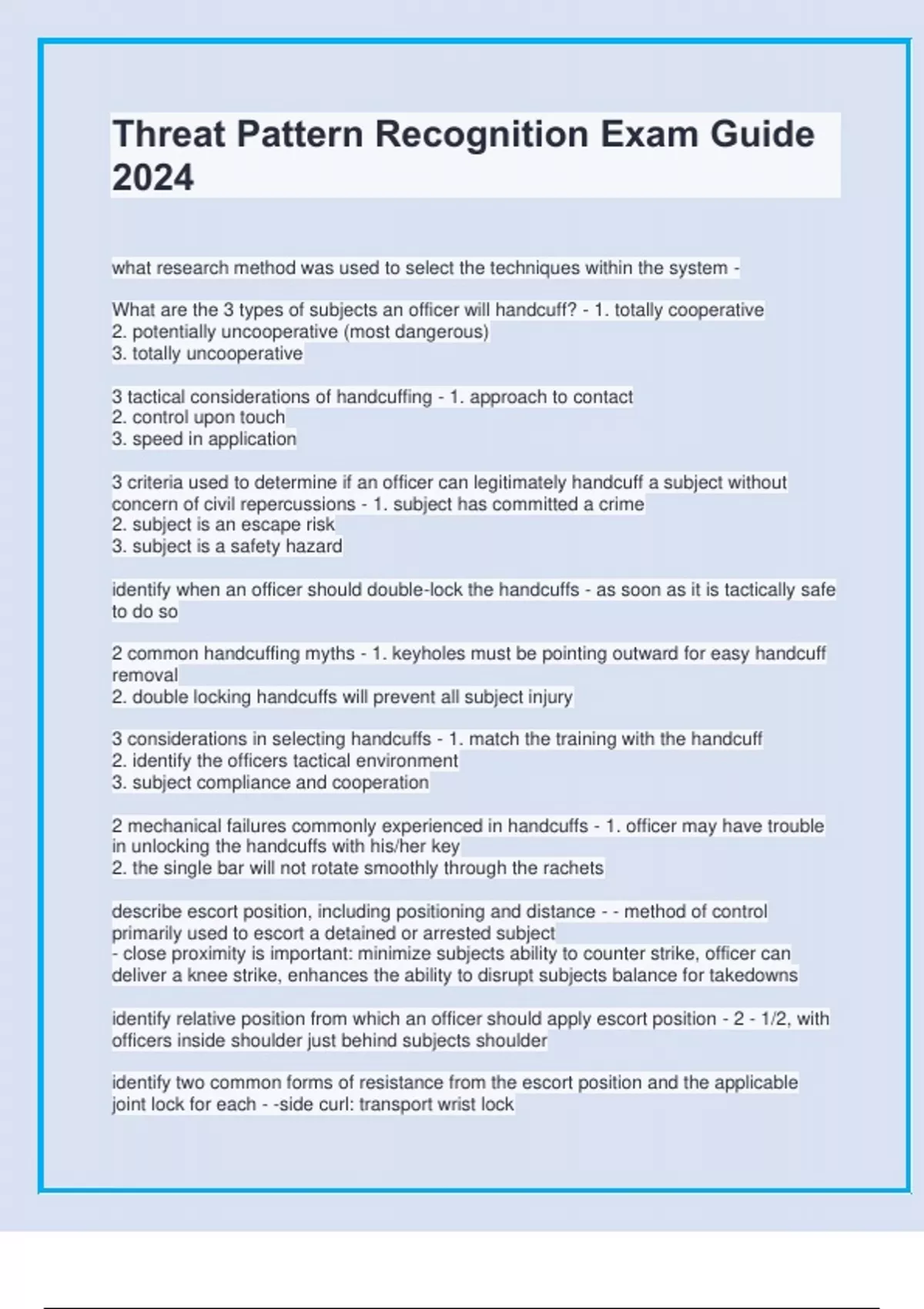 what research method was used to select the techniques within the system - What are the 3 types of subjects an officer will handcuff? - 1. totally cooperative 2. potentially uncooperative (most dangerous) 3. totally uncooperative 3 tactical considerations of handcuffing - 1. approach to contact 2. control upon touch 3. speed in application 3 criteria used to determine if an officer can legitimately handcuff a subject without concern of civil repercussions - 1. subject has committed a crime 2. subject is an escape risk 3. subject is a safety hazard identify when an officer should double-lock the handcuffs - as soon as it is tactically safe to do so 2 common handcuffing myths - 1. keyholes must be pointing outward for easy handcuff removal 2. double locking handcuffs will prevent all subject injury 3 considerations in selecting handcuffs - 1. match the training with the handcuff 2. identify the officers tactical environment 3. subject compliance and cooperation 2 mechanical failures commonly experienced in handcuffs - 1. officer may have trouble in unlocking the handcuffs with his/her key 2. the single bar will not rotate smoothly through the rachets describe escort position, including positioning and distance - - method of control primarily used to escort a detained or arrested subject - close proximity is important: minimize subjects ability to counter strike, officer can deliver a knee strike, enhances the ability to disrupt subjects balance for takedowns identify relative position from which an officer should apply escort position - 2 - 1/2, with officers inside shoulder just behind subjects shoulder identify two common forms of resistance from the escort position and the applicable joint lock for each - -side curl: transport wrist lock
