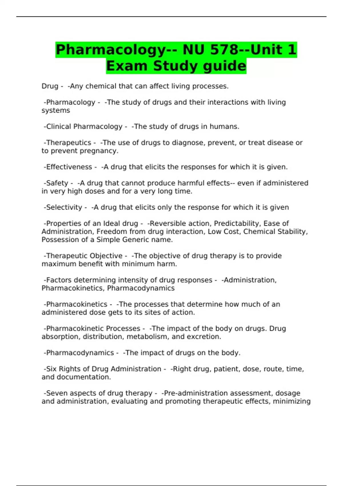 Pharmacology-- NU 578--Unit 1 Exam Study guide