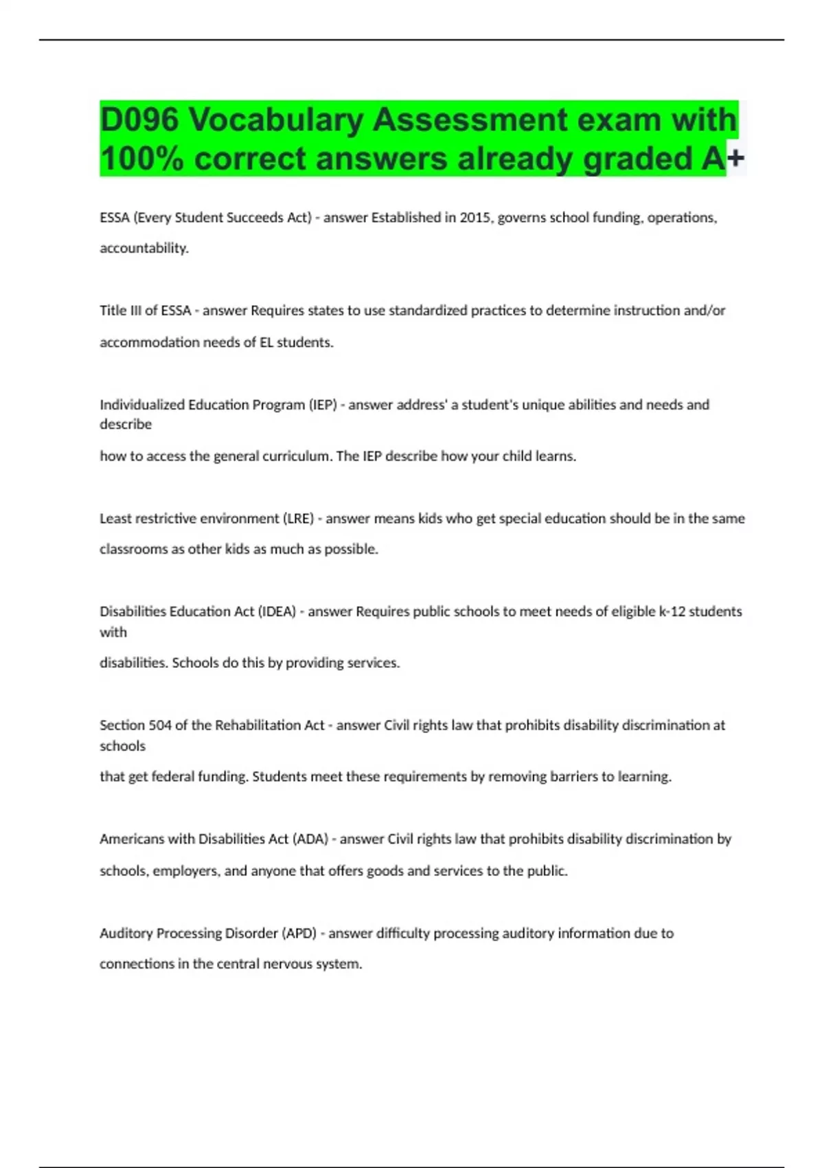 D096 Vocabulary Assessment exam with 100% correct answers already graded A+