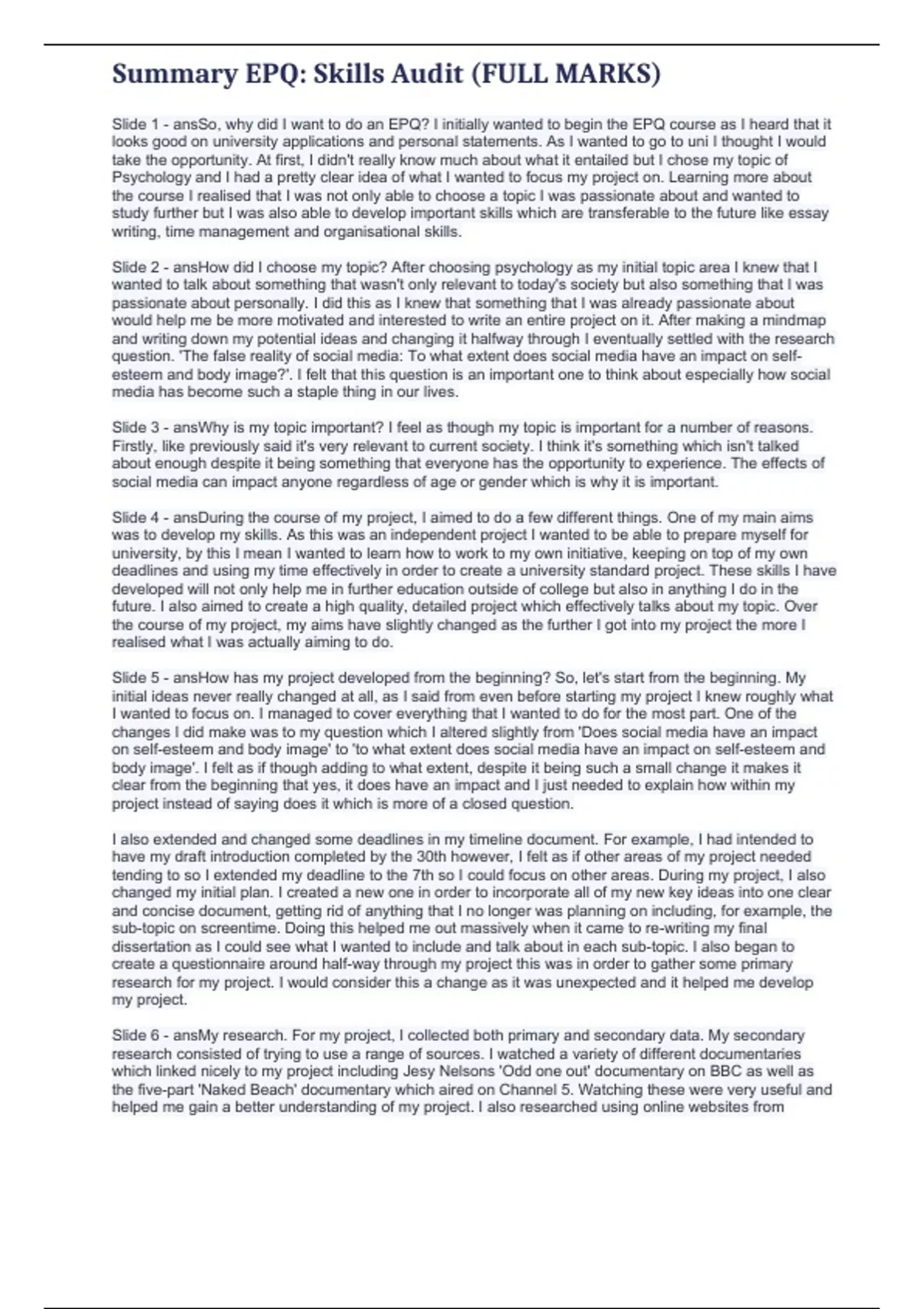 Summary EPQ: Skills Audit (FULL MARKS)