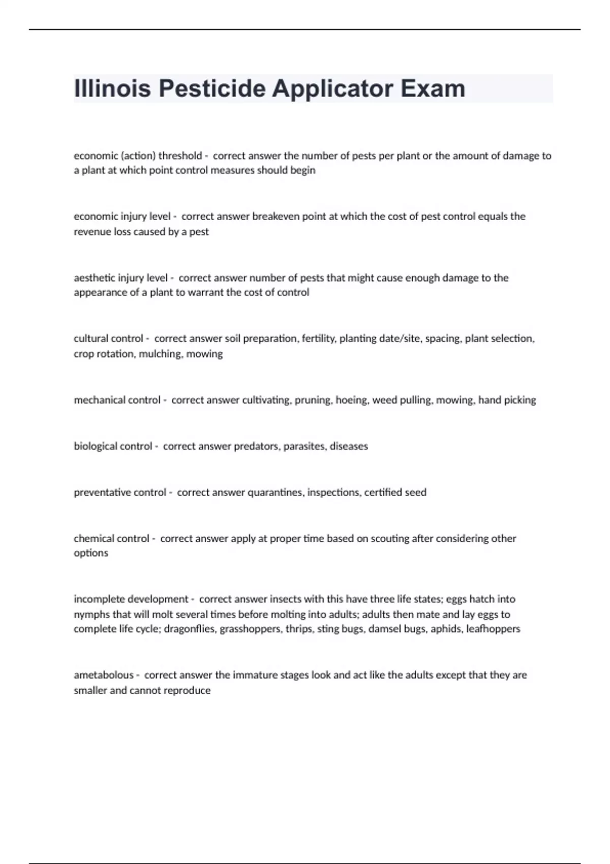 Illinois Pesticide Applicator Exameconomic (action) threshold - correct answer the number of pests per plant or the amount of damage to a plant at which point control measures should begin economic injury level - correct answer breakeven point at which the cost of pest control equals the revenue loss caused by a pest aesthetic injury level - correct answer number of pests that might cause enough damage to the appearance of a plant to warrant the cost of control cultural control - correct answer soil preparation, fertility, planting date/site, spacing, plant selection, crop rotation, mulching, mowing mechanical control - correct answer cultivating, pruning, hoeing, weed pulling, mowing, hand picking biological control - correct answer predators, parasites, diseases preventative control - correct answer quarantines, inspections, certified seed chemical control - correct answer apply at proper time based on scouting after considering other options incomplete development - correct answer insects with this have three life states; eggs hatch into nymphs that will molt several times before molting into adults; adults then mate and lay eggs to complete life cycle; dragonflies, grasshoppers, thrips, sting bugs, damsel bugs, aphids, leafhoppers ametabolous - correct answer the immature stages look and act like the adults except that they are smaller and cannot reproduce