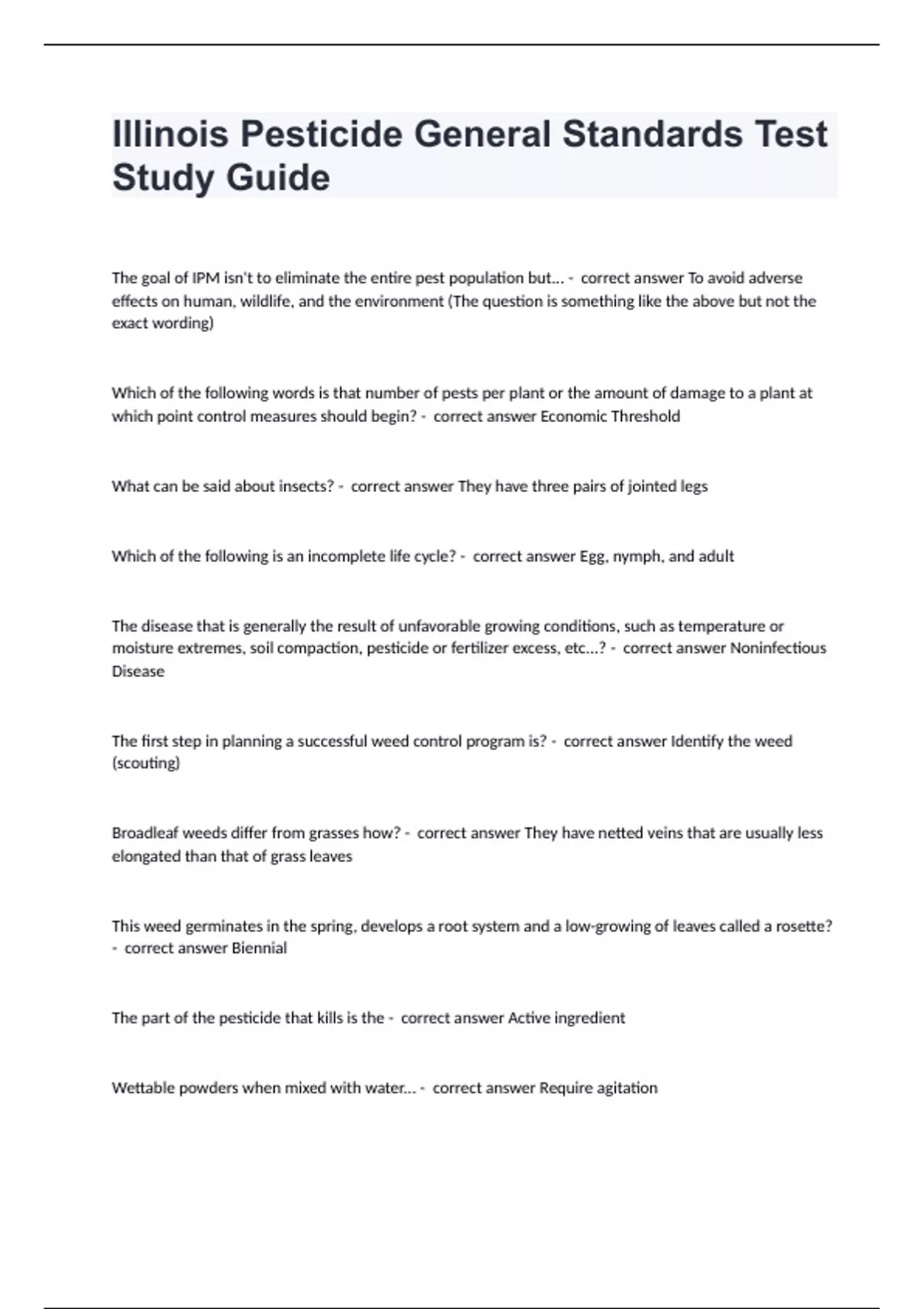 Illinois Pesticide General Standards Test Study GuideThe goal of IPM isn't to eliminate the entire pest population but... - correct answer To avoid adverse effects on human, wildlife, and the environment (The question is something like the above but not the exact wording) Which of the following words is that number of pests per plant or the amount of damage to a plant at which point control measures should begin? - correct answer Economic Threshold What can be said about insects? - correct answer They have three pairs of jointed legs Which of the following is an incomplete life cycle? - correct answer Egg, nymph, and adult The disease that is generally the result of unfavorable growing conditions, such as temperature or moisture extremes, soil compaction, pesticide or fertilizer excess, etc...? - correct answer Noninfectious Disease The first step in planning a successful weed control program is? - correct answer Identify the weed (scouting) Broadleaf weeds differ from grasses how? - correct answer They have netted veins that are usually less elongated than that of grass leaves This weed germinates in the spring, develops a root system and a low-growing of leaves called a rosette? - correct answer Biennial The part of the pesticide that kills is the - correct answer Active ingredient Wettable powders when mixed with water... - correct answer Require agitation