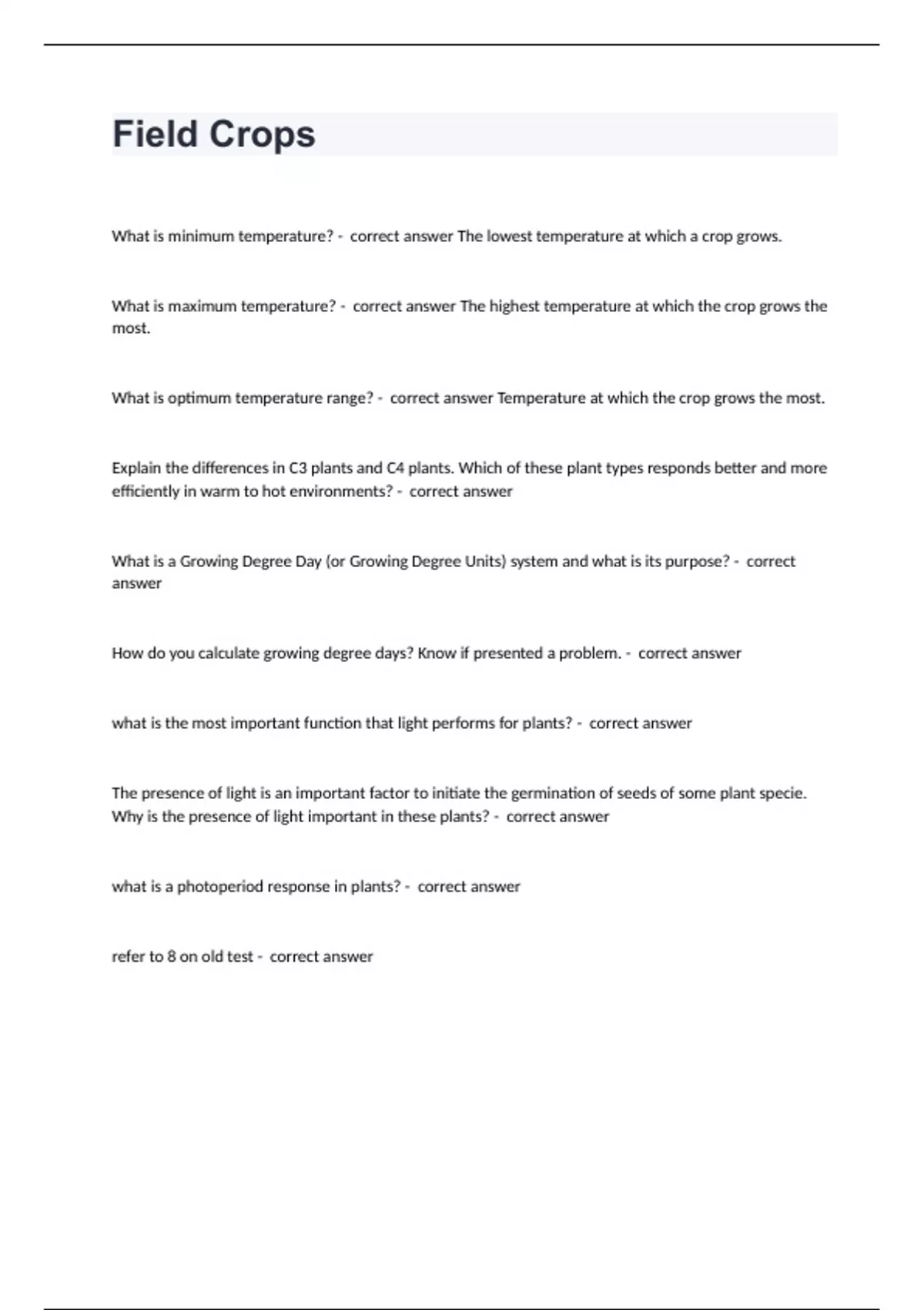 Field Crops What is minimum temperature? - correct answer The lowest temperature at which a crop grows. What is maximum temperature? - correct answer The highest temperature at which the crop grows the most. What is optimum temperature range? - correct answer Temperature at which the crop grows the most. Explain the differences in C3 plants and C4 plants. Which of these plant types responds better and more efficiently in warm to hot environments? - correct answer What is a Growing Degree Day (or Growing Degree Units) system and what is its purpose? - correct answer How do you calculate growing degree days? Know if presented a problem. - correct answer what is the most important function that light performs for plants? - correct answer The presence of light is an important factor to initiate the germination of seeds of some plant specie. Why is the presence of light important in these plants? - correct answer what is a photoperiod response in plants? - correct answer refer to 8 on old test - correct answer
