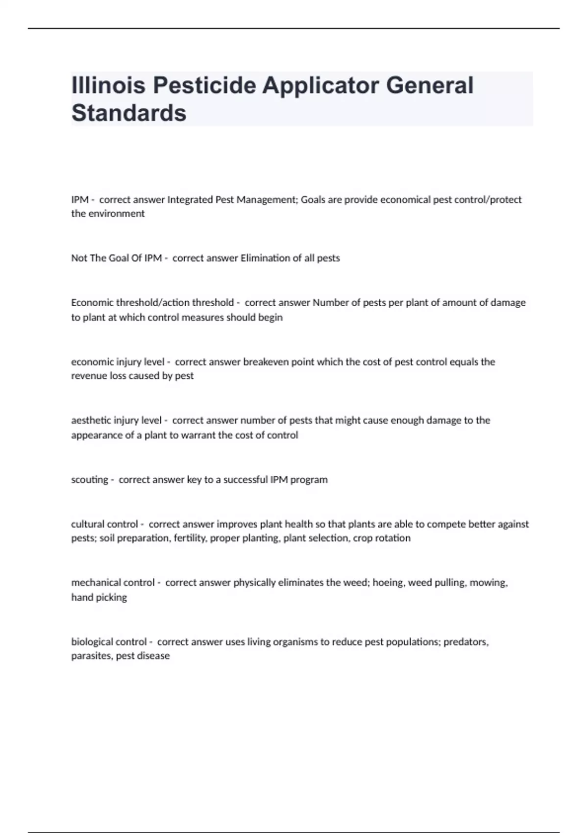 Illinois Pesticide Applicator General StandardsIPM - correct answer Integrated Pest Management; Goals are provide economical pest control/protect the environment Not The Goal Of IPM - correct answer Elimination of all pests Economic threshold/action threshold - correct answer Number of pests per plant of amount of damage to plant at which control measures should begin economic injury level - correct answer breakeven point which the cost of pest control equals the revenue loss caused by pest aesthetic injury level - correct answer number of pests that might cause enough damage to the appearance of a plant to warrant the cost of control scouting - correct answer key to a successful IPM program cultural control - correct answer improves plant health so that plants are able to compete better against pests; soil preparation, fertility, proper planting, plant selection, crop rotation mechanical control - correct answer physically eliminates the weed; hoeing, weed pulling, mowing, hand picking biological control - correct answer uses living organisms to reduce pest populations; predators, parasites, pest disease