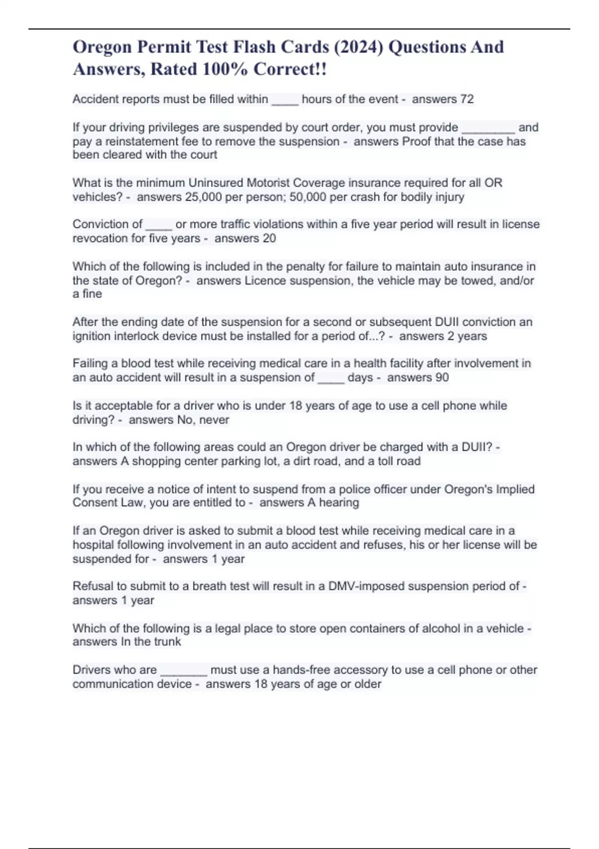 Oregon Permit Test Flash Cards (2024) Questions And Answers, Rated 100% Correct!!