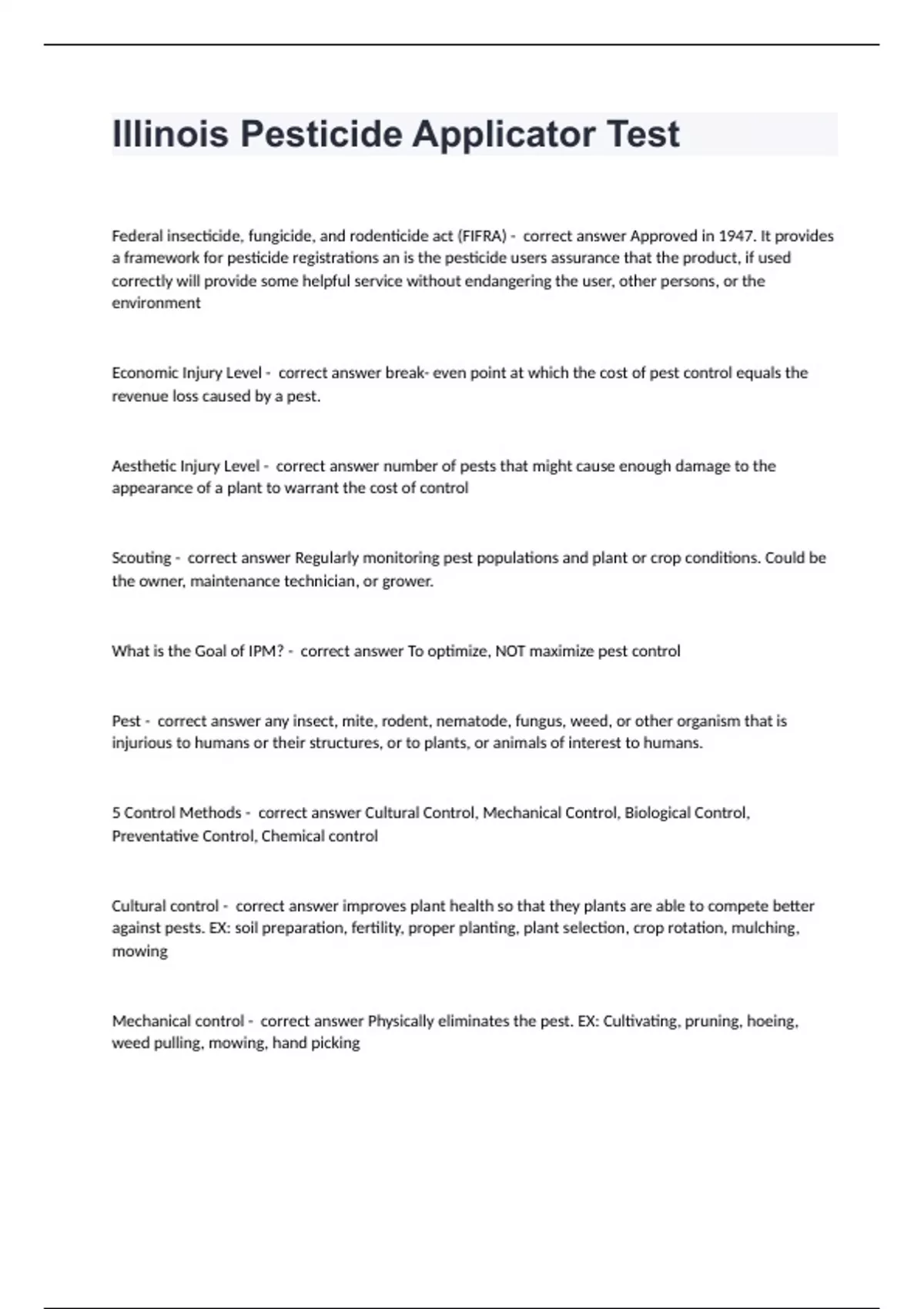 Illinois Field Crop Applicators Federal insecticide, fungicide, and rodenticide act (FIFRA) - correct answer Approved in 1947. It provides a framework for pesticide registrations an is the pesticide users assurance that the product, if used correctly will provide some helpful service without endangering the user, other persons, or the environment Economic Injury Level - correct answer break- even point at which the cost of pest control equals the revenue loss caused by a pest. Aesthetic Injury Level - correct answer number of pests that might cause enough damage to the appearance of a plant to warrant the cost of control Scouting - correct answer Regularly monitoring pest populations and plant or crop conditions. Could be the owner, maintenance technician, or grower. What is the Goal of IPM? - correct answer To optimize, NOT maximize pest control Pest - correct answer any insect, mite, rodent, nematode, fungus, weed, or other organism that is injurious to humans or their structures, or to plants, or animals of interest to humans. 5 Control Methods - correct answer Cultural Control, Mechanical Control, Biological Control, Preventative Control, Chemical control Cultural control - correct answer improves plant health so that they plants are able to compete better against pests. EX: soil preparation, fertility, proper planting, plant selection, crop rotation, mulching, mowing Mechanical control - correct answer Physically eliminates the pest. EX: Cultivating, pruning, hoeing, weed pulling, mowing, hand picking