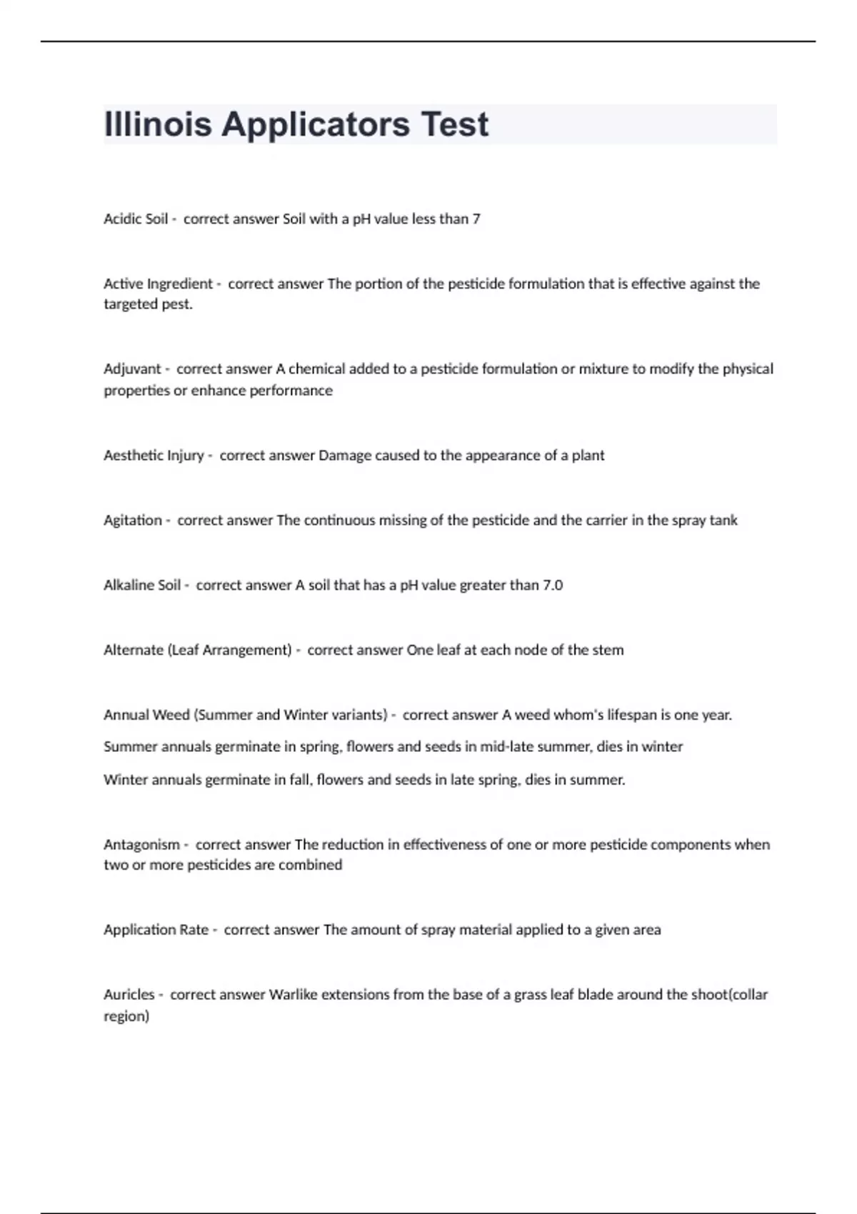Illinois Applicators Test Acidic Soil - correct answer Soil with a pH value less than 7 Active Ingredient - correct answer The portion of the pesticide formulation that is effective against the targeted pest. Adjuvant - correct answer A chemical added to a pesticide formulation or mixture to modify the physical properties or enhance performance Aesthetic Injury - correct answer Damage caused to the appearance of a plant Agitation - correct answer The continuous missing of the pesticide and the carrier in the spray tank Alkaline Soil - correct answer A soil that has a pH value greater than 7.0 Alternate (Leaf Arrangement) - correct answer One leaf at each node of the stem Annual Weed (Summer and Winter variants) - correct answer A weed whom's lifespan is one year. Summer annuals germinate in spring, flowers and seeds in mid-late summer, dies in winter Winter annuals germinate in fall, flowers and seeds in late spring, dies in summer. Antagonism - correct answer The reduction in effectiveness of one or more pesticide components when two or more pesticides are combined Application Rate - correct answer The amount of spray material applied to a given area Auricles - correct answer Warlike extensions from the base of a grass leaf blade around the shoot(collar region)