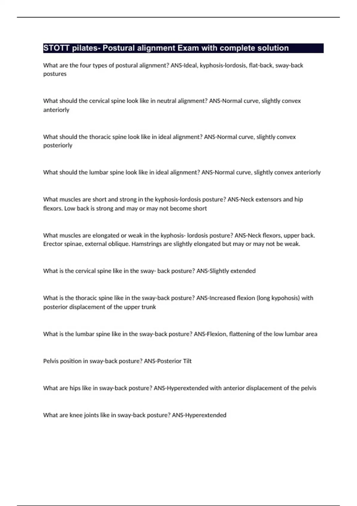 STOTT pilates- Postural alignment Exam with complete solution What are the four types of postural alignment? ANS-Ideal, kyphosis-lordosis, flat-back, sway-back postures What should the cervical spine look like in neutral alignment? ANS-Normal curve, slightly convex anteriorly What should the thoracic spine look like in ideal alignment? ANS-Normal curve, slightly convex posteriorly What should the lumbar spine look like in ideal alignment? ANS-Normal curve, slightly convex anteriorly What muscles are short and strong in the kyphosis-lordosis posture? ANS-Neck extensors and hip flexors. Low back is strong and may or may not become short What muscles are elongated or weak in the kyphosis- lordosis posture? ANS-Neck flexors, upper back. Erector spinae, external oblique. Hamstrings are slightly elongated but may or may not be weak. What is the cervical spine like in the sway- back posture? ANS-Slightly extended What is the thoracic spine like in the sway-back posture? ANS-Increased flexion (long kypohosis) with posterior displacement of the upper trunk What is the lumbar spine like in the sway-back posture? ANS-Flexion, flattening of the low lumbar area Pelvis position in sway-back posture? ANS-Posterior Tilt What are hips like in sway-back posture? ANS-Hyperextended with anterior displacement of the pelvis What are knee joints like in sway-back posture? ANS-Hyperextended