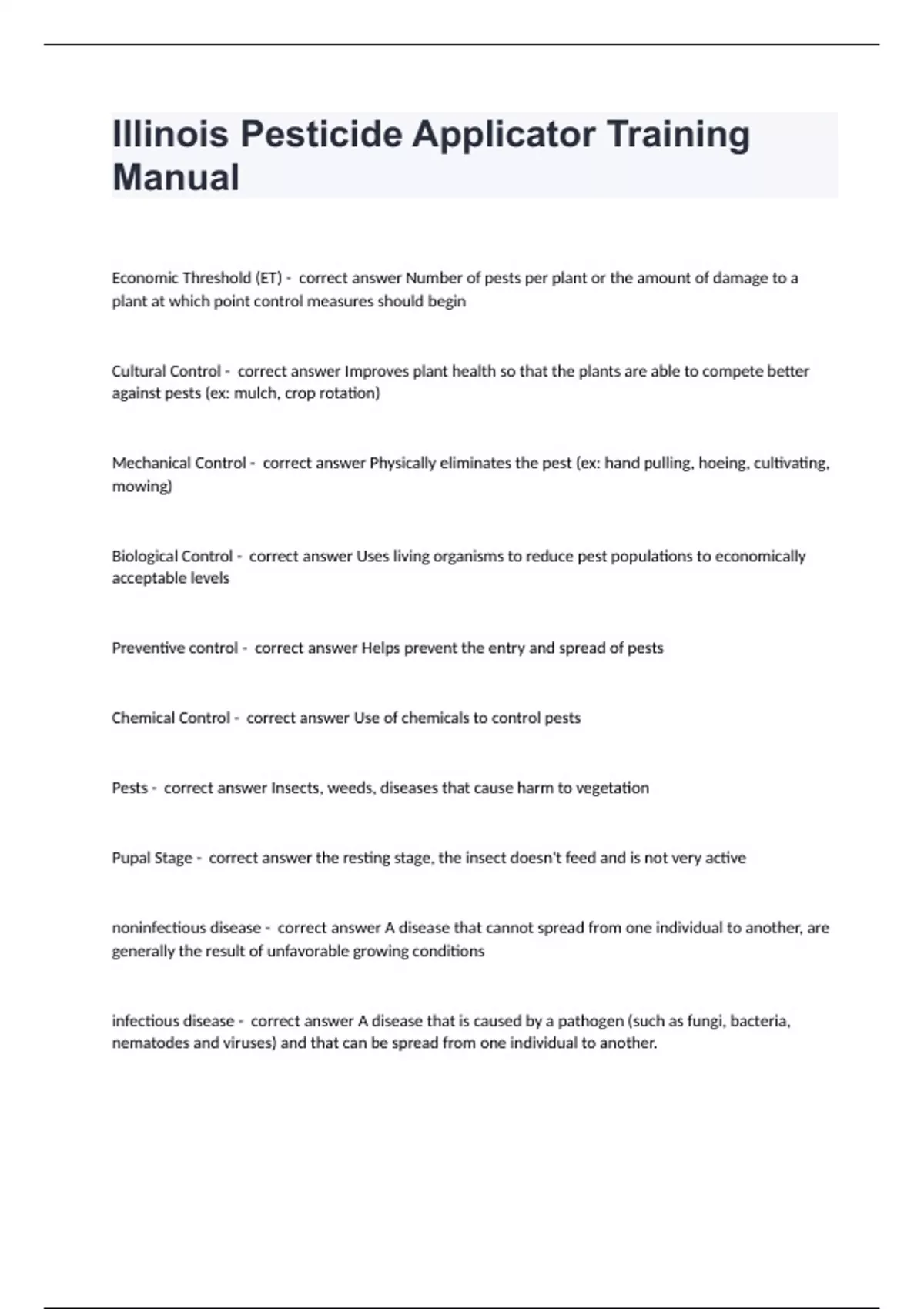 Illinois Pesticide Applicator Training ManualEconomic Threshold (ET) - correct answer Number of pests per plant or the amount of damage to a plant at which point control measures should begin Cultural Control - correct answer Improves plant health so that the plants are able to compete better against pests (ex: mulch, crop rotation) Mechanical Control - correct answer Physically eliminates the pest (ex: hand pulling, hoeing, cultivating, mowing) Biological Control - correct answer Uses living organisms to reduce pest populations to economically acceptable levels Preventive control - correct answer Helps prevent the entry and spread of pests Chemical Control - correct answer Use of chemicals to control pests Pests - correct answer Insects, weeds, diseases that cause harm to vegetation Pupal Stage - correct answer the resting stage, the insect doesn't feed and is not very active noninfectious disease - correct answer A disease that cannot spread from one individual to another, are generally the result of unfavorable growing conditions infectious disease - correct answer A disease that is caused by a pathogen (such as fungi, bacteria, nematodes and viruses) and that can be spread from one individual to another.