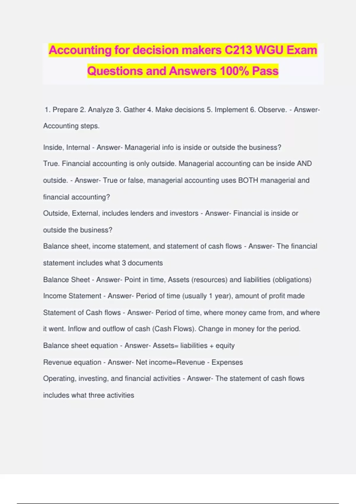 Accounting for decision makers C213 WGU Exam Questions and Answers 100% Pass 1. Prepare 2. Analyze 3. Gather 4. Make decisions 5. Implement 6. Observe. - Answer- Accounting steps. Inside, Internal - Answer- Managerial info is inside or outside the business? True. Financial accounting is only outside. Managerial accounting can be inside AND outside. - Answer- True or false, managerial accounting uses BOTH managerial and financial accounting? Outside, External, includes lenders and investors - Answer- Financial is inside or outside the business? Balance sheet, income statement, and statement of cash flows - Answer- The financial statement includes what 3 documents Balance Sheet - Answer- Point in time, Assets (resources) and liabilities (obligations) Income Statement - Answer- Period of time (usually 1 year), amount of profit made Statement of Cash flows - Answer- Period of time, where money came from, and where it went. Inflow and outflow of cash (Cash Flows). Change in money for the period. Balance sheet equation - Answer- Assets= liabilities + equity Revenue equation - Answer- Net income=Revenue - Expenses Operating, investing, and financial activities - Answer- The statement of cash flows includes what three activities FASB: Financial accounting standards. Private, no government involvement. It is a public process, includes individuals experienced in business and accounting (7 members). - Answer- The decision makers in the U.S. (accounting rules) GAAP: General accepted accounting principles - Answer- Developed by accounting rule makers. No Legal authority. comparability - Answer- We need accounting rules for... SEC: Security and exchange commission. Located in Article 1, Sec 8, Clause 3 - Answer- U.S. gov agency responsible for ensuring that investors, creditors, and other financial statement users are provided with reliable information. It watches behavior in financial markets. Registration statements (prospectus), Form 10-K, Form 10-Q, and schedule 14A (proxy statement). These are all publicly viewable. - Answer- What forms do the SEC regulate? Oversees stock exchanges, can suspend a company, investigate and suspect violations of the SEC rules. - Answer- What does the SEC do? YES. The SEC has legal authority to establish accounting rules and disclosure requirements. - Answer- Does the SEC have legal authority? USA congress->SEC->FASB - Answer- Financial accounting rule per the US constitution FASB: Financial accounting standards board - Answer- The SEC created the GAAP (has no legal authority) - Answer- FASB created AIPCA: American INSTITUTE of certified public accountants. - Answer- What sets auditory standards, continue education credits, CPA exam, and is the code of professional conduct? Only CPA's: Certified public accountants. - Answer- Who is the only person who can sign audit reports? PCAOB: Public company accounting oversight board. - Answer- The Sarbanes-Oxley Act "SOX" created? Under supervision of the SEC. - Answer- PCAOB is under supervision of? PCAOB: Public Company Accounting OVERSIGHT Board. - Answer- Who appoints members, approves actions, gov standards, inspections, and investigations? It is a private group and OVERSEES. AUDITORS? U.S. Gov agency that collects and regulates income taxes. Their primary goal is to collect revenue. - Answer- IRS Economic income and accounting income books. & Tax income, and cash flow books. - Answer- There are two sets of books. Tax Books and Financial accounting books. Similar to the FASB, but not 100% the same. It is international, everywhere but the U.S. - Answer- IASB: Internatonal Accounting Standard Board Who enforces and national policies. - Answer- Barriers to international convergence are? Condorsement - Answer- Rules set centrally, but legally adopted and enforced locally? The SEC, SOX, and PCAOB. - Answer- To increase government regulation, one would use: Reduce uncertainty and allows lenders and investors to target their financing and investing to the level of risk they are willing to take. - Answer- Financial statements Adudit - Answer- A financial statement that furthermore decreases uncertainty. Income Statement - Answer- Provides accountants the best attempt at measuring the economic performance of a company. Balance sheet - Answer- Mother of all financial statements. Accounting equation - Answer- Assets=liabilities+equity Assets (resoures) - Answer- Resources owned or controlled by a company that will provide probable future economic benefit. Liabilities (obligations) - Answer- Obligations that require the probable future sacrifice of economic benefits in the form of the transfer of assets or the providing of services. Equity - Answer- Investment amount in the business PLUS how much profit they have left in the business. L-A=E 1 paid in capital, 2 retained earnings, 3 treasure stock, 4 accumulated other comprehensive income. - Answer- Owners Equity PIC: Paid in capital - Answer- The amount originally paid in exchange for share of stock Retained earnings - Answer- CUMMULATIVE earnings that have been retained in the business Treasury stock - Answer- Company buys back its own shares of stock, shown as a subtraction from equity. AOCI: Accumulated other comprehensive income.Market related gains and losses that are not included on the income statement. - Answer- MARKET EVENTS that result in an increase or decrease in equity are