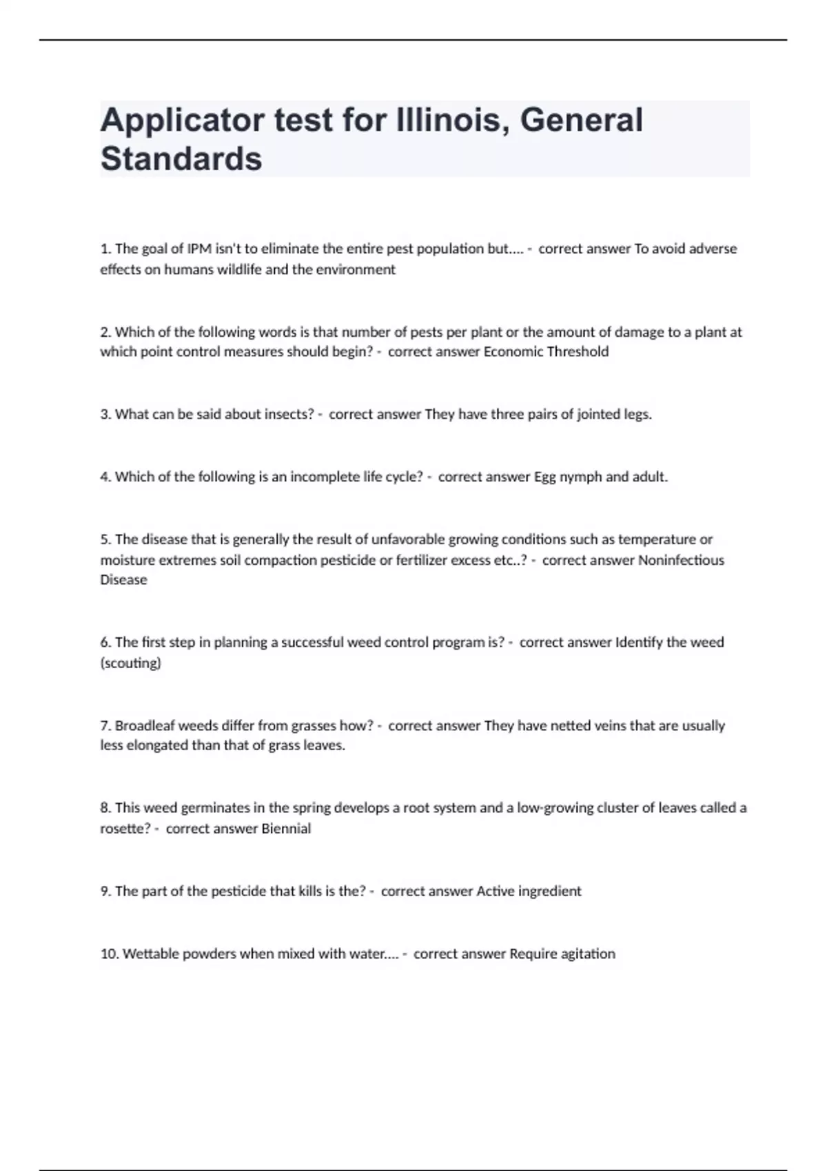Applicator test for Illinois, General Standards1. The goal of IPM isn't to eliminate the entire pest population but.... - correct answer To avoid adverse effects on humans wildlife and the environment 2. Which of the following words is that number of pests per plant or the amount of damage to a plant at which point control measures should begin? - correct answer Economic Threshold 3. What can be said about insects? - correct answer They have three pairs of jointed legs. 4. Which of the following is an incomplete life cycle? - correct answer Egg nymph and adult. 5. The disease that is generally the result of unfavorable growing conditions such as temperature or moisture extremes soil compaction pesticide or fertilizer excess etc..? - correct answer Noninfectious Disease 6. The first step in planning a successful weed control program is? - correct answer Identify the weed (scouting) 7. Broadleaf weeds differ from grasses how? - correct answer They have netted veins that are usually less elongated than that of grass leaves. 8. This weed germinates in the spring develops a root system and a low-growing cluster of leaves called a rosette? - correct answer Biennial 9. The part of the pesticide that kills is the? - correct answer Active ingredient 10. Wettable powders when mixed with water.... - correct answer Require agitation