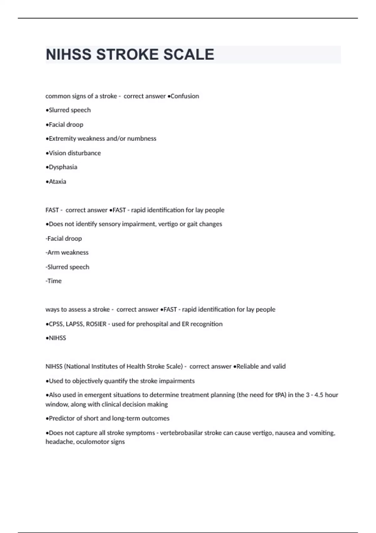 NIH Stroke Scale / NHISScommon signs of a stroke - correct answer •Confusion •Slurred speech •Facial droop •Extremity weakness and/or numbness •Vision disturbance •Dysphasia •Ataxia FAST - correct answer •FAST - rapid identification for lay people •Does not identify sensory impairment, vertigo or gait changes -Facial droop -Arm weakness -Slurred speech -Time ways to assess a stroke - correct answer •FAST - rapid identification for lay people •CPSS, LAPSS, ROSIER - used for prehospital and ER recognition •NIHSS NIHSS (National Institutes of Health Stroke Scale) - correct answer •Reliable and valid •Used to objectively quantify the stroke impairments •Also used in emergent situations to determine treatment planning (the need for tPA) in the 3 - 4.5 hour window, along with clinical decision making •Predictor of short and long-term outcomes •Does not capture all stroke symptoms - vertebrobasilar stroke can cause vertigo, nausea and vomiting, headache, oculomotor signs