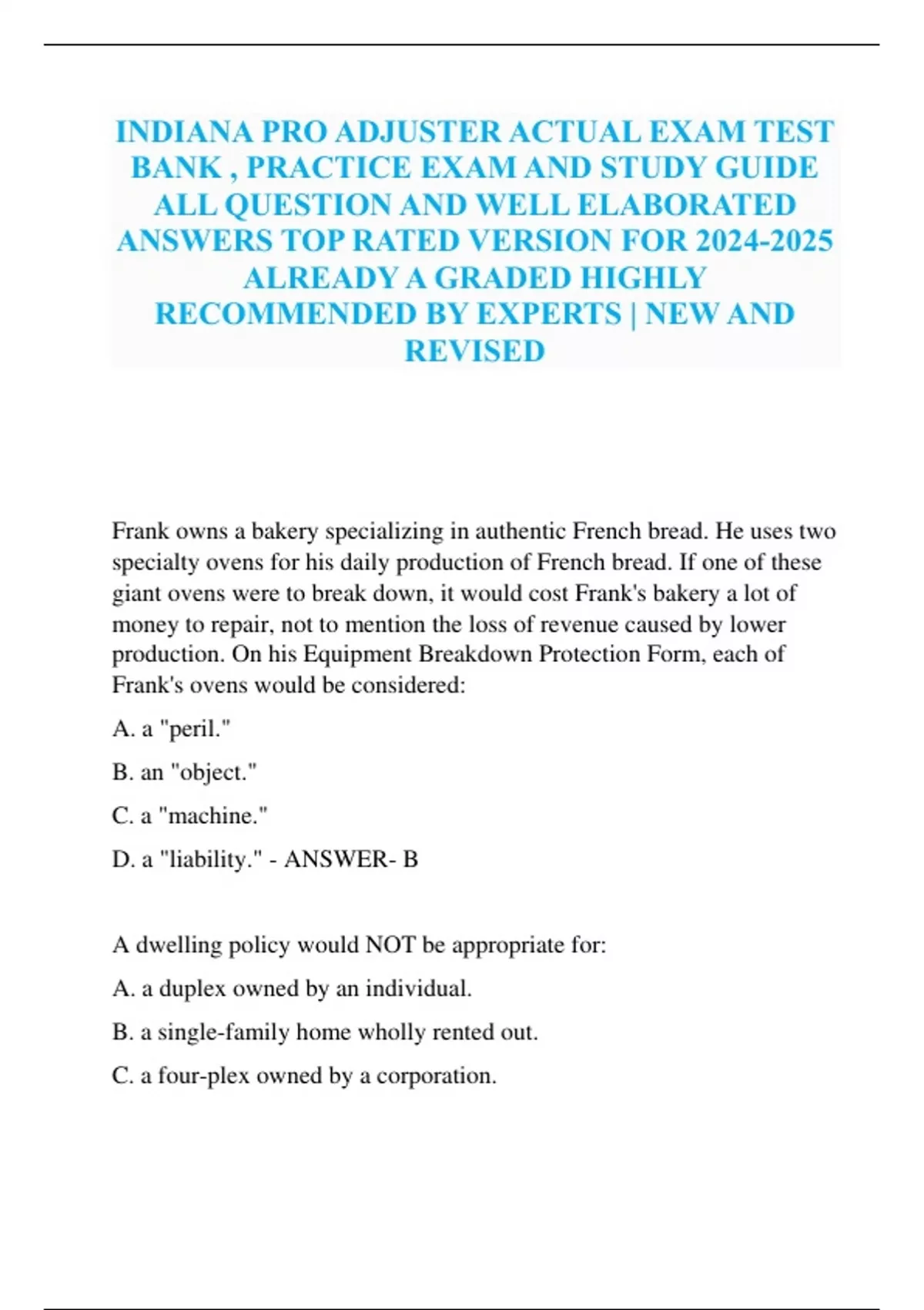 INDIANA PRO ADJUSTER ACTUAL EXAM TEST BANK , PRACTICE EXAM AND STUDY GUIDE ALL QUESTION AND WELL ELABORATED ANSWERS TOP RATED VERSION FOR ALREADY A GRADED HIGHLY RECOMMENDED BY EXPERTS | NEW AND REVISED