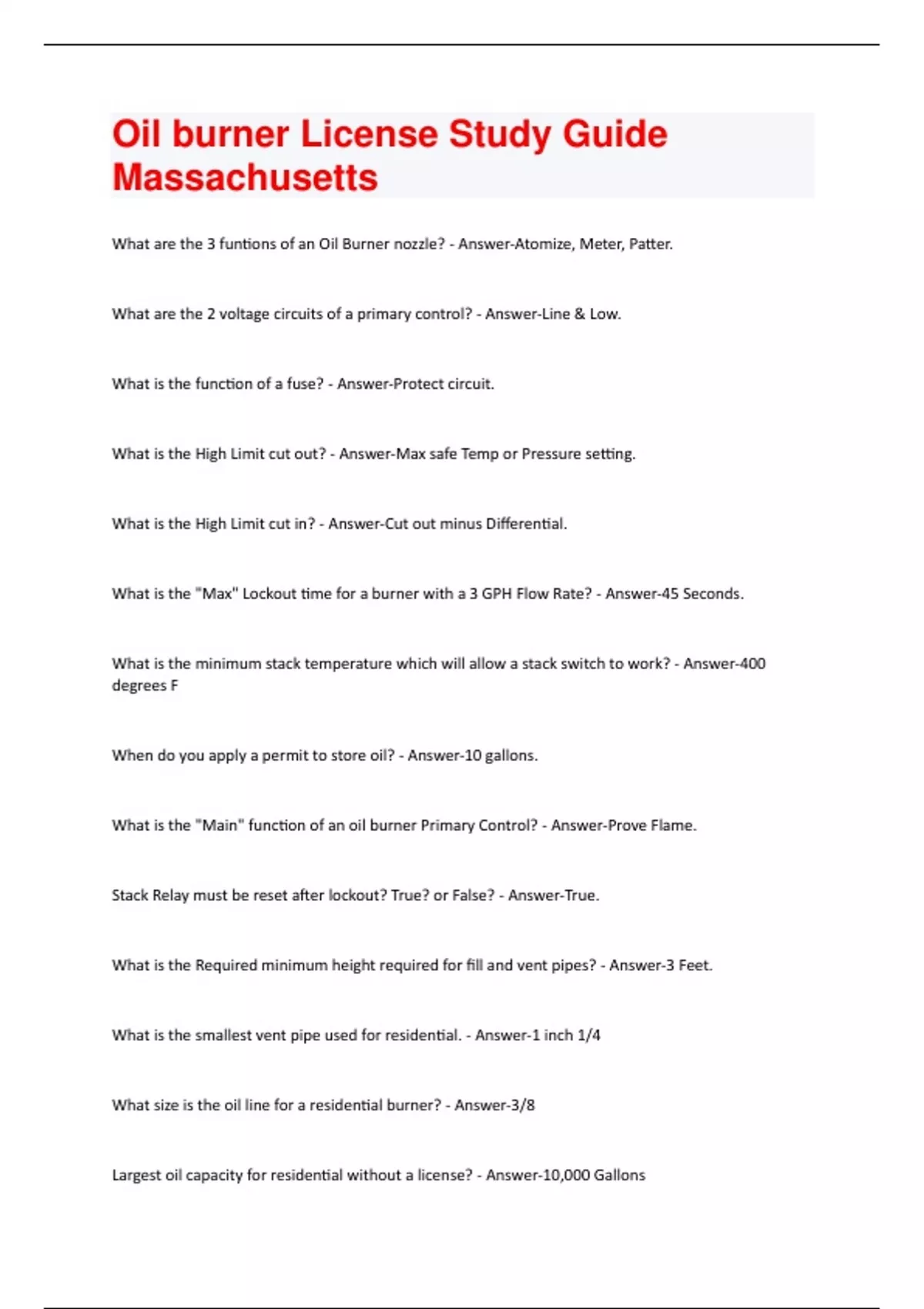 What are the 3 funtions of an Oil Burner nozzle? - Answer-Atomize, Meter, Patter. What are the 2 voltage circuits of a primary control? - Answer-Line & Low. What is the function of a fuse? - Answer-Protect circuit. What is the High Limit cut out? - Answer-Max safe Temp or Pressure setting. What is the High Limit cut in? - Answer-Cut out minus Differential. What is the "Max" Lockout time for a burner with a 3 GPH Flow Rate? - Answer-45 Seconds. What is the minimum stack temperature which will allow a stack switch to work? - Answer-400 degrees F When do you apply a permit to store oil? - Answer-10 gallons. What is the "Main" function of an oil burner Primary Control? - Answer-Prove Flame. Stack Relay must be reset after lockout? True? or False? - Answer-True. What is the Required minimum height required for fill and vent pipes? - Answer-3 Feet. What is the smallest vent pipe used for residential. - Answer-1 inch 1/4 What size is the oil line for a residential burner? - Answer-3/8 Largest oil capacity for residential without a license? - Answer-10,000 GallonsAt what height ceiling would a second thermal switch be required? - Answer-12' A typical residential oil burner is also s/u to run Kerosene True? Or False? - Answer-False Permit to install an oil burner is issued by the? - Answer-State Fire Marshall