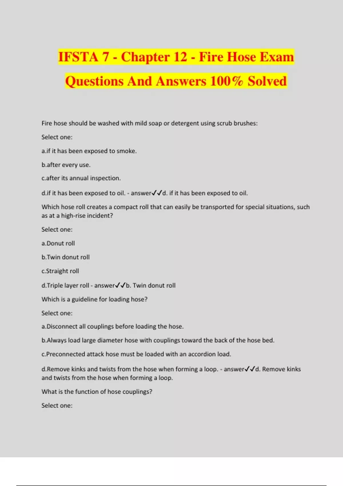 IFSTA 7 - Chapter 12 - Fire Hose Exam Questions And Answers 100% Solved Fire hose should be washed with mild soap or detergent using scrub brushes: Select one: it has been exposed to smoke. every use. its annual inspection. it has been exposed to oil. - answerd. if it has been exposed to oil. Which hose roll creates a compact roll that can easily be transported for special situations, such as at a high-rise incident? Select one: a.Donut roll b.Twin donut roll c.Straight roll d.Triple layer roll - answerb. Twin donut roll Which is a guideline for loading hose? Select one: a.Disconnect all couplings before loading the hose. b.Always load large diameter hose with couplings toward the back of the hose bed. c.Preconnected attack hose must be loaded with an accordion load. d.Remove kinks and twists from the hose when forming a loop. - answerd. Remove kinks and twists from the hose when forming a loop. What is the function of hose couplings? Select one: a.Measure water pressure in the fire hose b.Connect sections of hose together to form one long hoseline c.Adapt supply hose so it can be used as attack hose d.Enable different departments to use each other's hose - answerb. Connect sections of hose together to form one long hoseline What should be done in order to prevent mechanical damage to fire hose? Select one: a.Clear windows of broken glass before deploying hose through them. b.Allow a small amount of water to remain in the hose when it is stored to prevent the lining from drying out. c.Open and close nozzles quickly to limit excessive stress on the hose. d.Position the folds of the hose in the same way every time it is reloaded on the apparatus. - answera. Clear windows of broken glass before deploying hose through them. Hard suction hose is commonly used: Select one: drafting from a static water source. when soft sleeve hose is not available. connect to a fire department connection for a standpipe. situations when multiple departments' hoses must be connected. - answera. for drafting from a static water source. Preconnected attack hose must be: Select one: d flat rather than on its edge. charged before being deployed from the hose bed. deployed from the hose bed before charging the line. d using a triple layer or minuteman load. - answerc. fully deployed from the hose bed before charging the line. What can be done to help prevent thermal damage to hose? Select one: a.Use a steam generating device to prevent hose linings from drying out. b.Avoid laying hose on hot pavement to dry. c.Use a mechanical hose dryer instead of allowing hose to air dry. d.Store hose with a small amount of water in it so the inner lining doesn't dry out. - answerb. Avoid laying hose on hot pavement to dry. Which type of hose transports water from the hydrant or static water source to the pumping apparatus? Select one: a.Booster hose b.Preconnect hose c.Attack hose d.Supply hose - answerd. Supply hose Which hose roll leaves only one coupling exposed? Select one: a.Triple layer roll b.Donut roll c.Twin donut roll d.Straight roll - answerd. Straight roll When loading hose into the hose bed on an apparatus, hose should be: Select one: d loose enough to fit a gloved hand between the folds. d with both couplings toward the front. d as tightly as possible. d with both couplings toward the rear. - answera. loaded loose enough to fit a gloved hand between the folds. Which is the best way to load large diameter supply hose? Select one: a.Horseshoe load