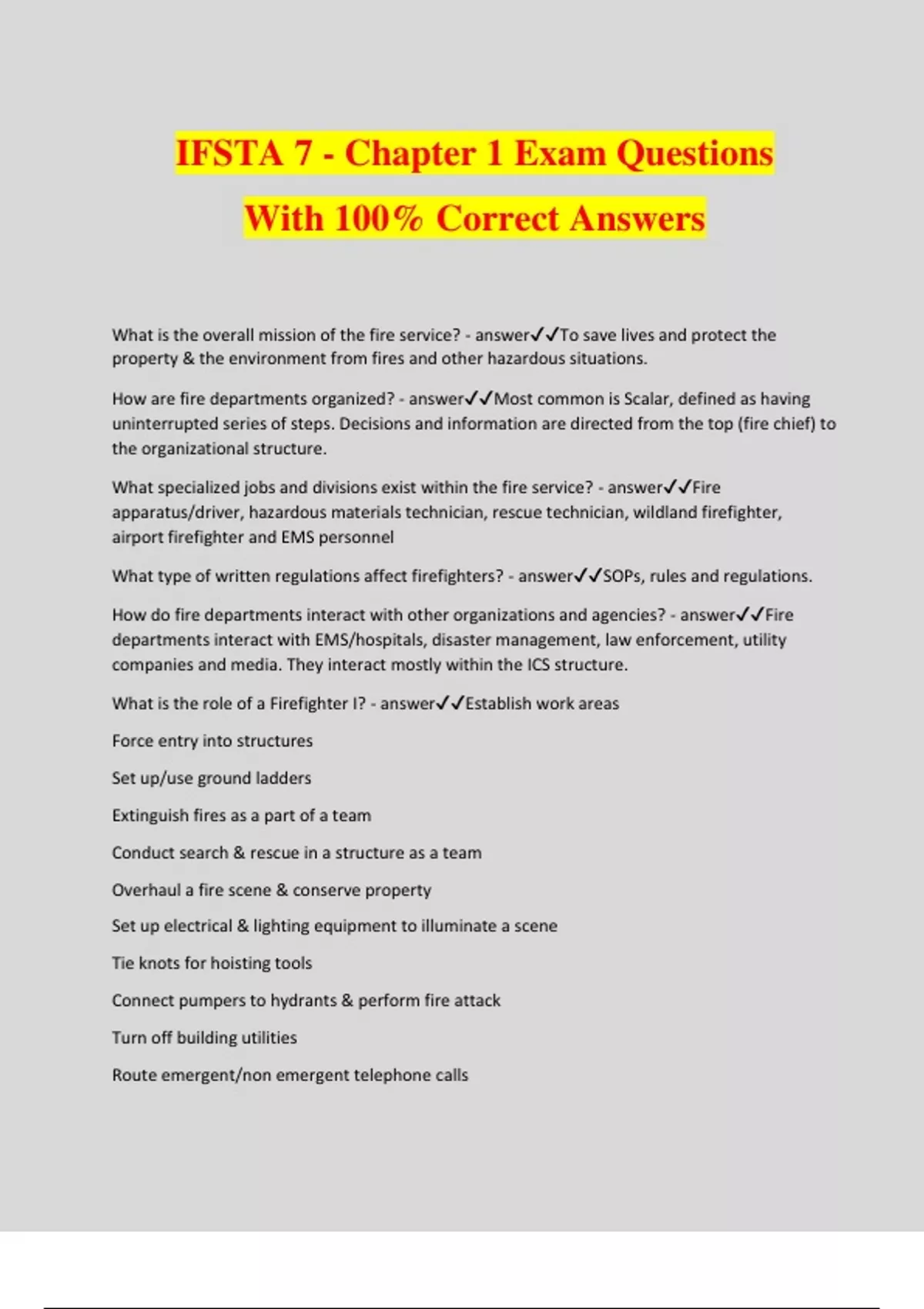IFSTA 7 - Chapter 1 Exam Questions With 100% Correct Answers What is the overall mission of the fire service? - answerTo save lives and protect the property & the environment from fires and other hazardous situations. How are fire departments organized? - answerMost common is Scalar, defined as having uninterrupted series of steps. Decisions and information are directed from the top (fire chief) to the organizational structure. What specialized jobs and divisions exist within the fire service? - answerFire apparatus/driver, hazardous materials technician, rescue technician, wildland firefighter, airport firefighter and EMS personnel What type of written regulations affect firefighters? - answerSOPs, rules and regulations. How do fire departments interact with other organizations and agencies? - answerFire departments interact with EMS/hospitals, disaster management, law enforcement, utility companies and media. They interact mostly within the ICS structure. What is the role of a Firefighter I? - answerEstablish work areas Force entry into structures Set up/use ground ladders Extinguish fires as a part of a team Conduct search & rescue in a structure as a team Overhaul a fire scene & conserve property Set up electrical & lighting equipment to illuminate a scene Tie knots for hoisting tools Connect pumpers to hydrants & perform fire attack Turn off building utilities Route emergent/non emergent telephone calls Radio communication Prepare apparatus hose loads for response Clean, inspect & maintain: Ladders, Ropes, ventilation equipment, hoses, SCBAs, salvage equipment, hand tools and PPE What fire and life safety initiatives have been created to help reduce firefighter line of duty illnesses, injuries, and fatalities? - answerThe 16 firefighter life safety initiatives, also known as "everyone goes home" What are some requirements of NFPA 1500 that relate to firefighter safety and health? - answerSpecifies minimum requirements for a fire department safety & health programs. How do fire department programs help combat illness, injuries, and fatalities? - answerEstablish wellness programs and initiatives to guide firefighters towards a healthy lifestyle. What are the most common line of duty illnesses and injuries that affect firefighters? - answercardiovascular disease How do physical fitness and healthy lifestyle practices affect firefighter performance and safety? - answerYour body will be better able to withstand stress and allow ypu to be fit for duty. How do fire department member assistance programs benefit firefighters? - answerThe Member Assistance Program (MAP) provides confidential counseling, guidance and referral services to help Members and their families manage personal and work-related problems What safety guidelines should be followed when deploying and using emergency scene lighting? - answerUse two personnel to safely carry portable generators to their set up position Ensure portable generators are positioned down wind so the exhaust fumes do not present an ignition or contamination hazard Wear hearing protection when operation portable generators Be aware that generator noise can make communications near these devices difficult Always adjust lights to a height that allows light to be directed toward a scene, but not into the eyes of approaching drivers Remove damaged cords with faulty insulation or exposed wires from service Do not immerse power cords and connections in water Never connect more lights than the power source can support