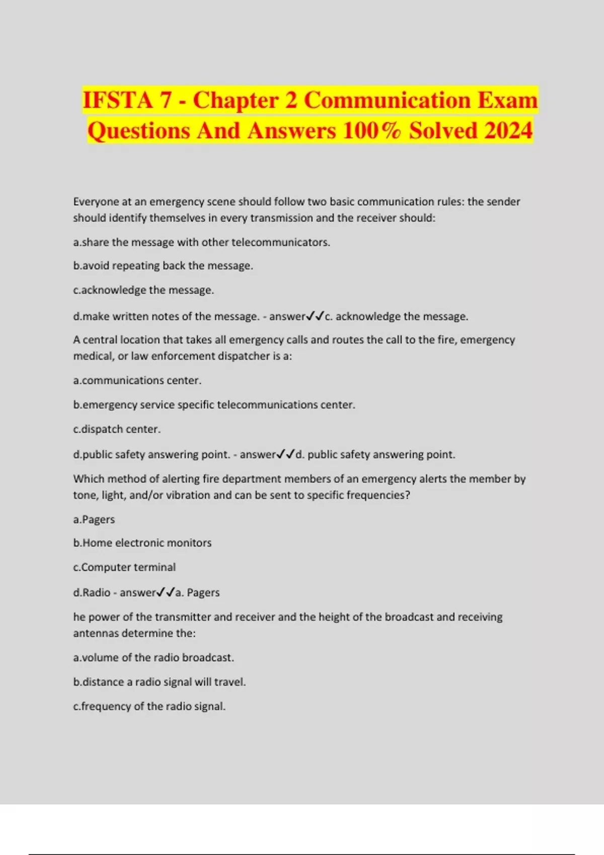 IFSTA 7 - Chapter 2 Communication Exam Questions And Answers 100% Solved 2024 Everyone at an emergency scene should follow two basic communication rules: the sender should identify themselves in every transmission and the receiver should: the message with other telecommunicators. repeating back the message. wledge the message. written notes of the message. - answerc. acknowledge the message. A central location that takes all emergency calls and routes the call to the fire, emergency medical, or law enforcement dispatcher is a: nications center. ency service specific telecommunications center. tch center. c safety answering point. - answerd. public safety answering point. Which method of alerting fire department members of an emergency alerts the member by tone, light, and/or vibration and can be sent to specific frequencies? a.Pagers b.Home electronic monitors c.Computer terminal d.Radio - answera. Pagers he power of the transmitter and receiver and the height of the broadcast and receiving antennas determine the: e of the radio broadcast. nce a radio signal will travel. ency of the radio signal. r of radios that can use a given channel. - answerb. distance a radio signal will travel. Individuals who are trained to receive, process, and dispatch emergency calls are known as: ommunicators. ollers. ncers. operators. - answera. telecommunicators. When answering nonemergency telephone calls, remember to be professional and courteous because you are: paid to be professional. y to be speaking with an officer. senting your department. to be evaluated on this behavior. - answerc. representing your department. Enhanced 9-1-1 systems provide dispatchers with information such as the caller's location, phone number, and: type of emergency at the caller's location. caller's first and last name. tions to the caller's location. video of the current conditions at the location. - answerc. directions to the caller's location. Which federal agency issues radio licenses to fire departments that operate radio equipment? a.Federal Communications Commission (FCC) b.Federal Trade Commission (FTC) c.Federal Emergency Management Agency (FEMA) d.Federal Aviation Administration (FAA) - answera. Federal Communications Commission (FCC) Remote areas or locations inside structures that cause the loss of cellular telephone service or radio signals are known as: nt noise zones.