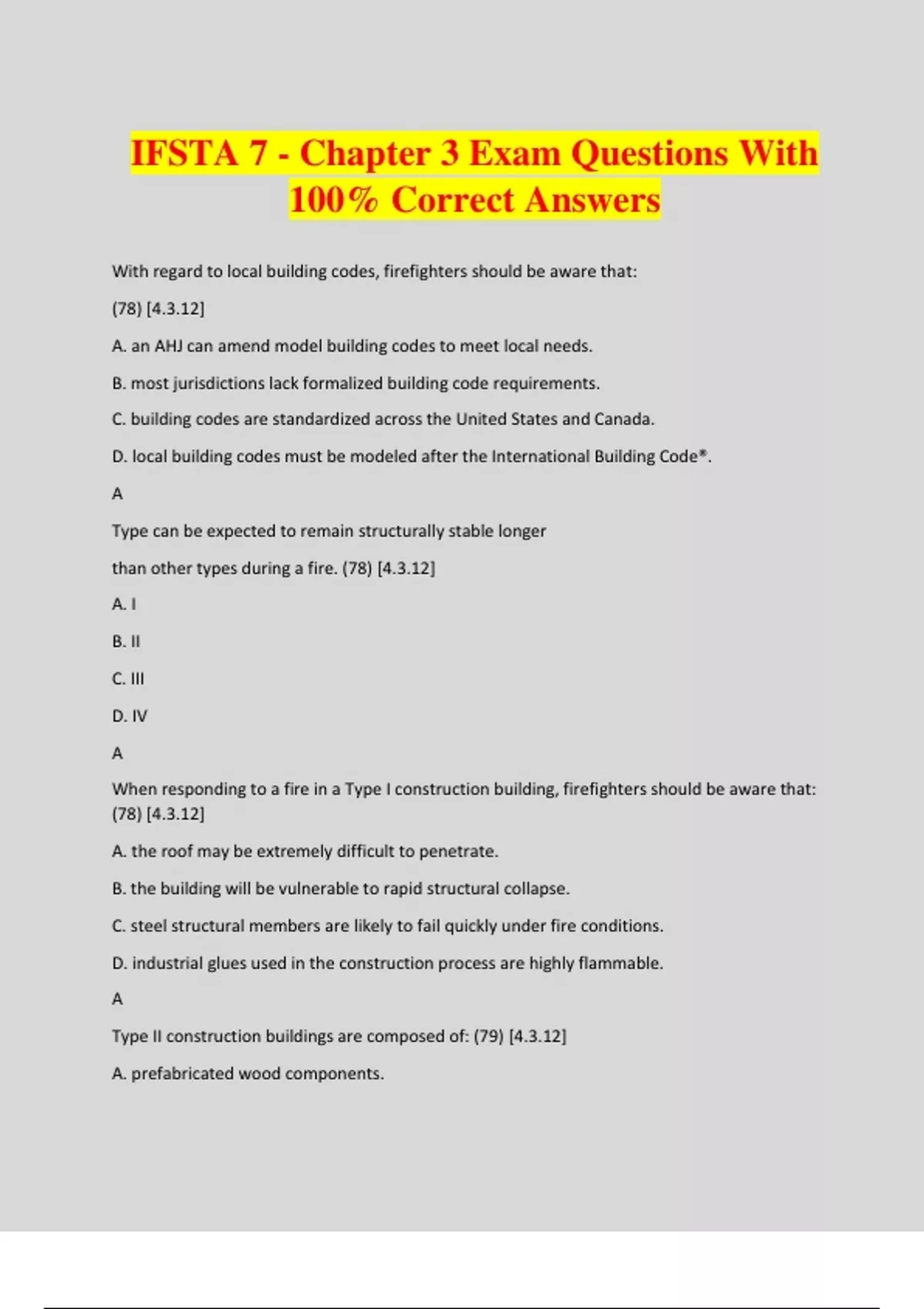 IFSTA 7 - Chapter 3 Exam Questions With 100% Correct Answers With regard to local building codes, firefighters should be aware that: (78) [4.3.12] A. an AHJ can amend model building codes to meet local needs. B. most jurisdictions lack formalized building code requirements. C. building codes are standardized across the United States and Canada. D. local building codes must be modeled after the International Building Code®. A Type can be expected to remain structurally stable longer than other types during a fire. (78) [4.3.12] A. I B. II C. III D. IV A When responding to a fire in a Type I construction building, firefighters should be aware that: (78) [4.3.12] A. the roof may be extremely difficult to penetrate. B. the building will be vulnerable to rapid structural collapse. C. steel structural members are likely to fail quickly under fire conditions. D. industrial glues used in the construction process are highly flammable. A Type II construction buildings are composed of: (79) [4.3.12] A. prefabricated wood components. B. large-dimensioned lumber or laminated wood. C. metal and wood components that increase the fuel load. D. noncombustible materials that do not add to the fuel load. D In a Type III construction building, the interior walls, columns, beams, floors, and roofs are completely or partially constructed of: (79) [4.3.12] A. steel. B. wood. C. gypsum. D. concrete. B What condition often found in Type III construction buildings is likely to negatively influence fire behavior? (79) [4.3.12] A. Void spaces between wall studs B. Large-dimensioned wood beams C. Concrete roofs that are difficult to penetrate D. Reinforced concrete columns and decorative arches A Type IV buildings are resistant to structural collapse because of the: (81) [4.3.12] A. use of open-web floor joists. B. use of noncombustible interior finishes. C. thickness of the reinforced concrete walls. D. mass of the heavy timber structural members. D Which characteristic of Type IV construction buildings can contribute to the intensity of a fire once it starts? (81) [4.3.12] A. Precast concrete columns B. High concentration of wood C. Many voids or concealed spaces D. Unprotected steel framing members B Which construction classification includes buildings with exterior load bearing walls composed entirely of wood and is commonly referred to as wood frame construction? (81) [4.3.12] A. Type II B. Type III C. Type IV D. Type V D Type V construction buildings may have a veneer of stucco, brick, or stone that: (81) [4.3.12] A. provides little fire protection. B. offers the appearance of a Type I building. C. significantly enhances the structural support. D. produces dark smoke and adds to the fire load. A The most common type of factory built home that firefighters will encounter is the A. mobile B. pre-cut C. modular D. panelized A What is one construction requirement of newer factory built homes that has helped to reduce fire loss and residential fatalities? (83) [4.3.12]