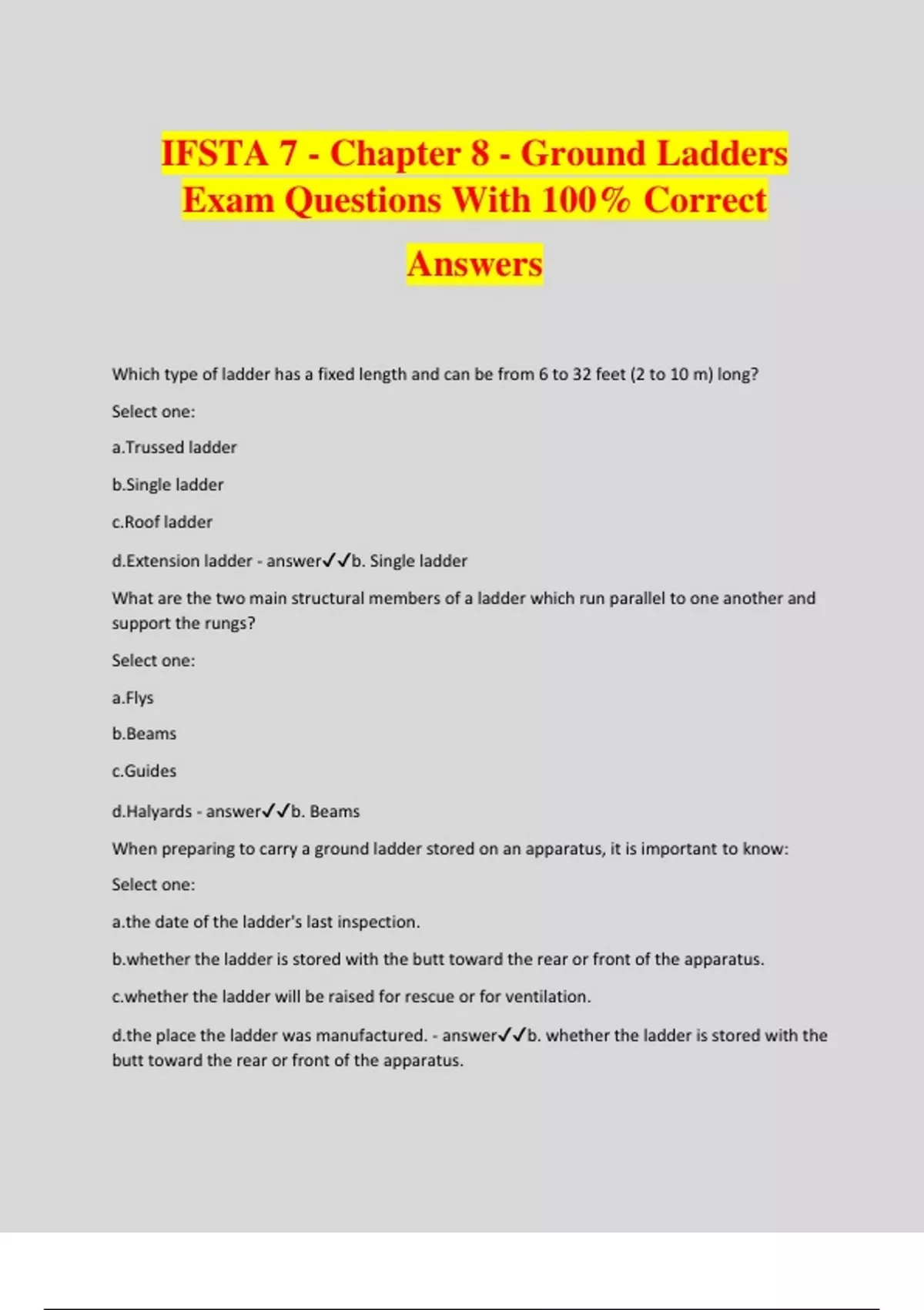 IFSTA 7 - Chapter 8 - Ground Ladders Exam Questions With 100% Correct Answers Which type of ladder has a fixed length and can be from 6 to 32 feet (2 to 10 m) long? Select one: a.Trussed ladder b.Single ladder c.Roof ladder d.Extension ladder - answerb. Single ladder What are the two main structural members of a ladder which run parallel to one another and support the rungs? Select one: a.Flys b.Beams c.Guides d.Halyards - answerb. Beams When preparing to carry a ground ladder stored on an apparatus, it is important to know: Select one: date of the ladder's last inspection. er the ladder is stored with the butt toward the rear or front of the apparatus. er the ladder will be raised for rescue or for ventilation. place the ladder was manufactured. - answerb. whether the ladder is stored with the butt toward the rear or front of the apparatus. What are the horizontal cross members of a ladder that provide a foothold in order for a firefighter to climb? Select one: a.Truss blocks b.Rungs c.Beams d.Tie rods - answerb. Rungs The recommended climbing angle for ladders is usually _____ degrees. Select one: a.110 b.55 c.75 d.95 - answerc. 75 What is a method of preventing a ground ladder from moving once it has been placed? Select one: a.Heeling b.Locking c.Spurring d.Pawling - answera. Heeling What should be done if damage is found during a ladder inspection? Select one: a.Send the ladder back to the manufacturer for an advanced inspection. b.Discard the ladder and purchase a newer model. c.Remove the ladder from service until it can be repaired and tested. d.Continue using the ladder but notify a supervisor. - answerc. Remove the ladder from service until it can be repaired and tested. According to NFPA 1932, ground ladders should be inspected after every use and at least: Select one: lly. ly. . y. - answerb. monthly. According to NFPA 1931, all ladders are required to have a: Select one: ce stripe. listing the date of purchase. fication label. reflective tip. - answerc. certification label. When carrying a roof ladder, the: Select one: should be open. r must be carried vertically. should be closed. r must be carried tip first. - answerc. hooks should be closed. If a firefighter needs to use both hands while working on a ladder, he or she should use a ladder belt or _____ to secure to the ladder. Select one: iner y system lock - answerd. leg lock Before raising a ladder, it is important to: Select one: d the ladder to its designated length. for overhead obstructions.