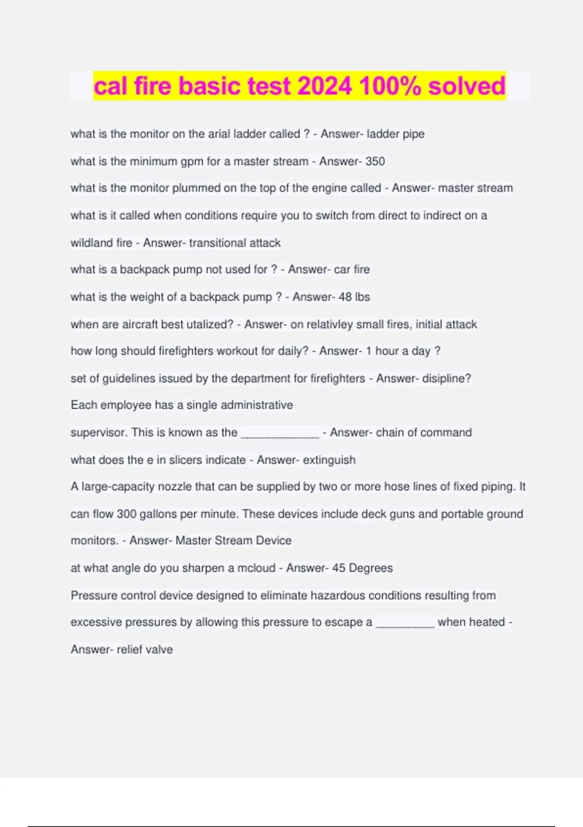 cal fire basic test 2024 100% solved what is the monitor on the arial ladder called ? - Answer- ladder pipe what is the minimum gpm for a master stream - Answer- 350 what is the monitor plummed on the top of the engine called - Answer- master stream what is it called when conditions require you to switch from direct to indirect on a wildland fire - Answer- transitional attack what is a backpack pump not used for ? - Answer- car fire what is the weight of a backpack pump ? - Answer- 48 lbs when are aircraft best utalized? - Answer- on relativley small fires, initial attack how long should firefighters workout for daily? - Answer- 1 hour a day ? set of guidelines issued by the department for firefighters - Answer- disipline? Each employee has a single administrative supervisor. This is known as the ____________ - Answer- chain of command what does the e in slicers indicate - Answer- extinguish A large-capacity nozzle that can be supplied by two or more hose lines of fixed piping. It can flow 300 gallons per minute. These devices include deck guns and portable ground monitors. - Answer- Master Stream Device at what angle do you sharpen a mcloud - Answer- 45 Degrees Pressure control device designed to eliminate hazardous conditions resulting from excessive pressures by allowing this pressure to escape a _________ when heated - Answer- relief valve