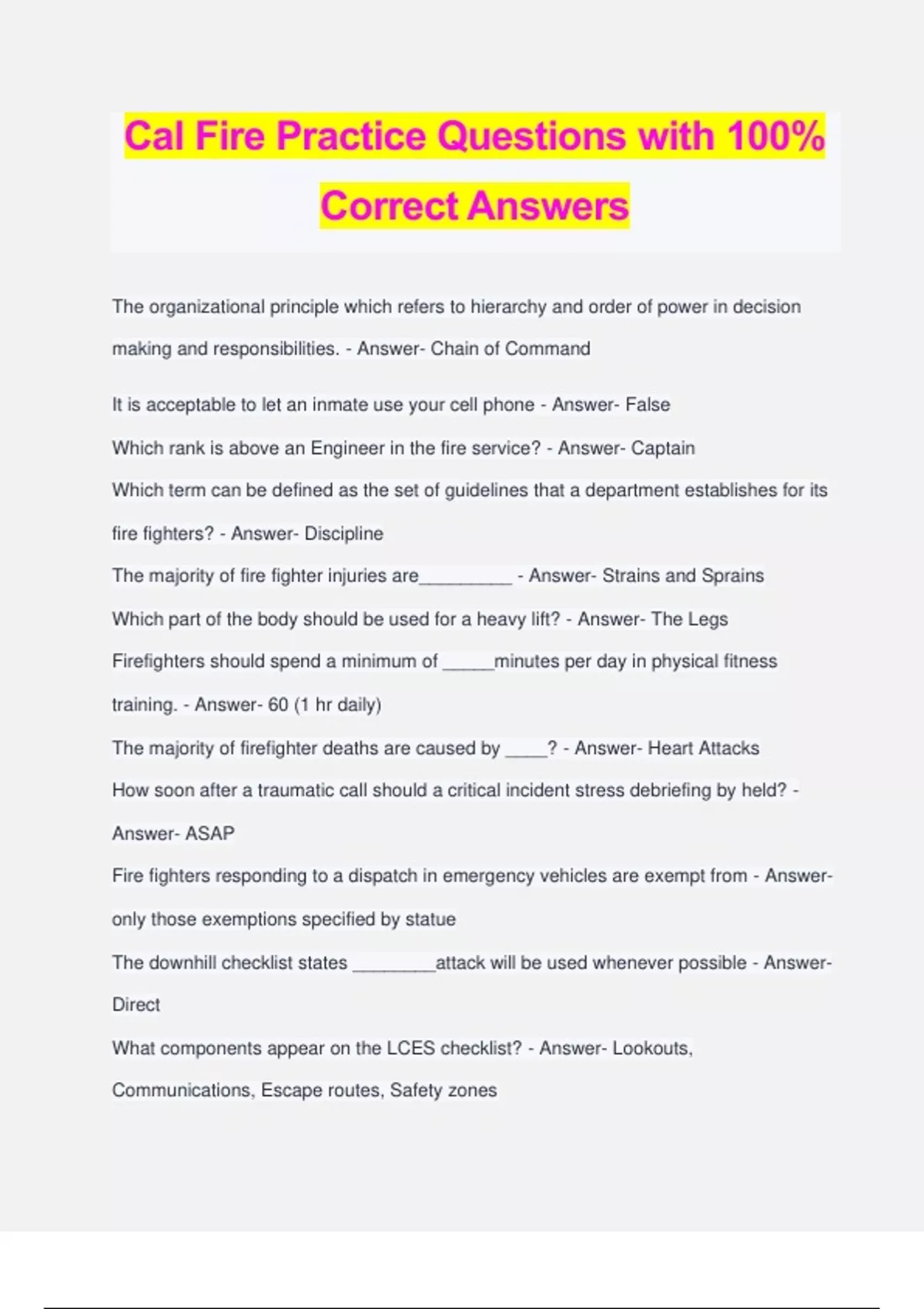 Cal Fire Practice Questions with 100% Correct Answers The organizational principle which refers to hierarchy and order of power in decision making and responsibilities. - Answer- Chain of Command It is acceptable to let an inmate use your cell phone - Answer- False Which rank is above an Engineer in the fire service? - Answer- Captain Which term can be defined as the set of guidelines that a department establishes for its fire fighters? - Answer- Discipline The majority of fire fighter injuries are_________ - Answer- Strains and Sprains Which part of the body should be used for a heavy lift? - Answer- The Legs Firefighters should spend a minimum of _____minutes per day in physical fitness training. - Answer- 60 (1 hr daily) The majority of firefighter deaths are caused by ____? - Answer- Heart Attacks How soon after a traumatic call should a critical incident stress debriefing by held? - Answer- ASAP Fire fighters responding to a dispatch in emergency vehicles are exempt from - Answer- only those exemptions specified by statue The downhill checklist states ________attack will be used whenever possible - Answer- Direct What components appear on the LCES checklist? - Answer- Lookouts, Communications, Escape routes, Safety zones What is the correct term for a radio system permanently mounted in a building? - Answer- Base Station The bar of a pry bar acts as a _______to multiply the amount of force that can be applied. - Answer- Lever Which tool is designed to pull a lock cylinder out of a door? - Answer- The K tool Using a spring loaded center punch to break tempered automobile glass results in ________ - Answer- many small uniformed pieces of glass Which hazardous material is commonly found in vehicle batteries? - Answer- Sulfuric Acid Which statement most accurately describes a transitional attack - Answer- An offensive attack initiated from the exterior Which items is installed on propane cylinders to allow excess pressure to escape? - Answer- Relief Valve Operations are conducted from inside the fire building in which operational mode - Answer- Offensive