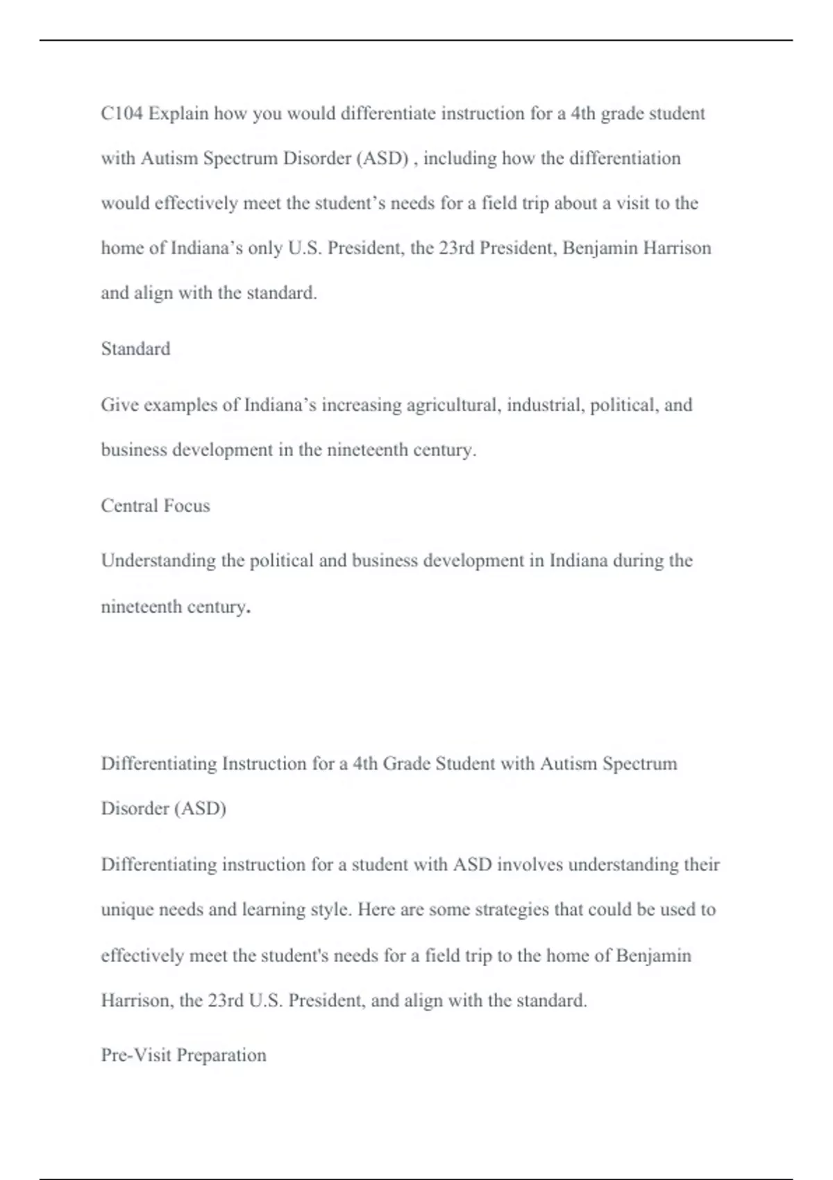 C104 Explain how you would differentiate instruction for a 4th grade student with Autism S C104 Explain how you would differentiate instruction for a 4th grade student with Autism Spectrum Disorder (ASD) , including how the differentiation would effectively meet the students needs for a field trip about a visit to the home of Indianas only U.S. President, the 23rd President, Benjamin Harrison and align with the standard. Standard Give examples of Indianas increasing agricultural, industrial, political, and business development in the nineteenth century. Central Focus Understanding the political and business development in Indiana during the nineteenth century. Differentiating Instruction for a 4th Grade Student with Autism Spectrum Disorder (ASD) Differentiating instruction for a student with ASD involves understanding their unique needs and learning style. Here are some strategies that could be used to effectively meet the student's needs for a field trip to the