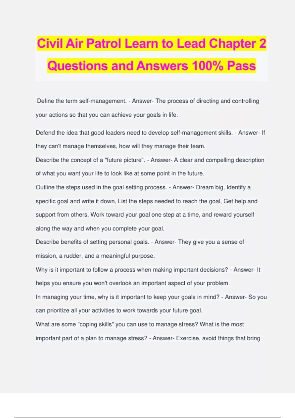 Civil Air Patrol Learn to Lead Chapter 2 Questions and Answers 100% Pass Define the term self-management. - Answer- The process of directing and controlling your actions so that you can achieve your goals in life. Defend the idea that good leaders need to develop self-management skills. - Answer- If they can't manage themselves, how will they manage their team. Describe the concept of a "future picture". - Answer- A clear and compelling description of what you want your life to look like at some point in the future. Outline the steps used in the goal setting process. - Answer- Dream big, Identify a specific goal and write it down, List the steps needed to reach the goal, Get help and support from others, Work toward your goal one step at a time, and reward yourself along the way and when you complete your goal. Describe benefits of setting personal goals. - Answer- They give you a sense of mission, a rudder, and a meaningful purpose.