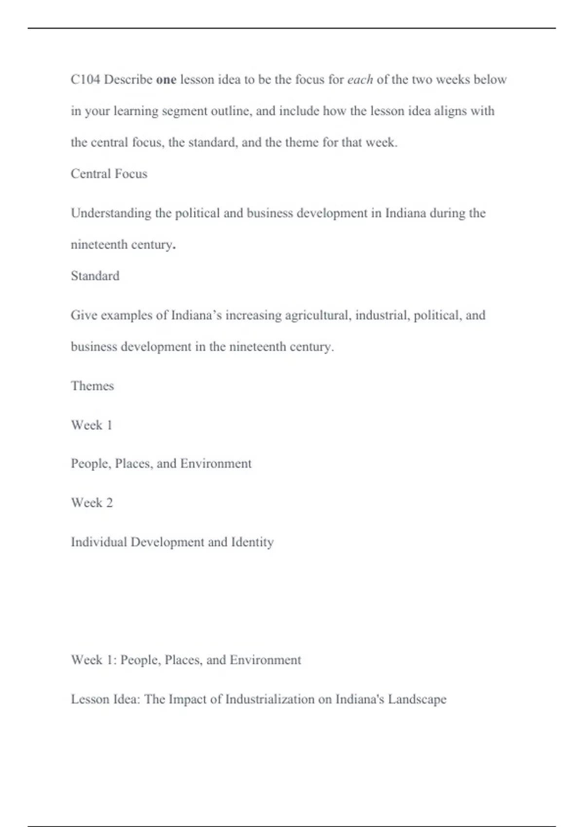 C104 Describe one lesson idea to be the focus for each of the two weeks below in your lear C104 Describe one lesson idea to be the focus for each of the two weeks below in your learning segment outline, and include how the lesson idea aligns with the central focus, the standard, and the theme for that week. Central Focus Understanding the political and business development in Indiana during the nineteenth century. Standard Give examples of Indianas increasing agricultural, industrial, political, and business development in the nineteenth century. Themes Week 1 People, Places, and Environment Week 2 Individual Development and Identity Week 1: People, Places, and Environment Lesson Idea: The Impact of Industrialization on Indiana's Landscape This lesson will explore how the industrial revolution and the growth of business during the 19th century transformed Indiana's physical landscape and environment. Students will examine historical maps, photographs, and documen