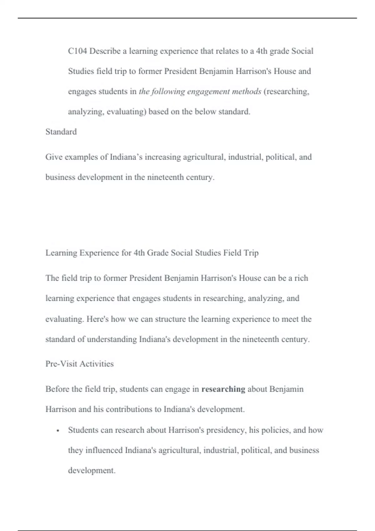 C104 Describe a learning experience that relates to a 4th grade Social Studies field trip C104 Describe a learning experience that relates to a 4th grade Social Studies field trip to former President Benjamin Harrison's House and engages students in the following engagement methods (researching, analyzing, evaluating) based on the below standard. Standard Give examples of Indianas increasing agricultural, industrial, political, and business development in the nineteenth century. Learning Experience for 4th Grade Social Studies Field Trip The field trip to former President Benjamin Harrison's House can be a rich learning experience that engages students in researching, analyzing, and evaluating. Here's how we can structure the learning experience to meet the standard of understanding Indiana's development in the nineteenth century. Pre-Visit Activities Before the field trip, students can engage in researching about Benjamin Harrison and his contributions to India