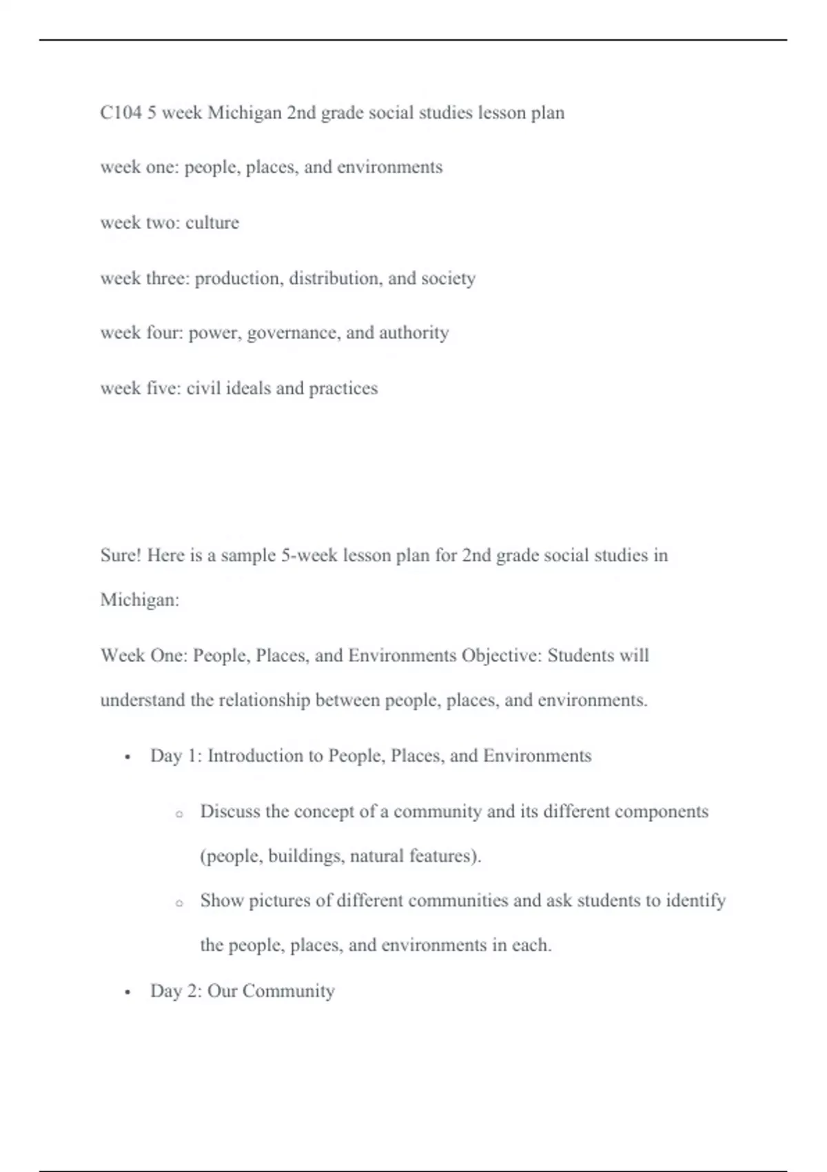 C104 5 week Michigan 2nd grade social studies lesson plan week one: people, places, and e C104 5 week Michigan 2nd grade social studies lesson plan week one: people, places, and environments week two: culture week three: production, distribution, and society week four: power, governance, and authority week five: civil ideals and practices Sure! Here is a sample 5-week lesson plan for 2nd grade social studies in Michigan: Week One: People, Places, and Environments Objective: Students will understand the relationship between people, places, and environments. ï‚·Day 1: Introduction to People, Places, and Environments oDiscuss the concept of a community and its different components (people, buildings, natural features). oShow pictures of different communities and ask students to identify the people, places, and environments in each. ï‚·Day 2: Our Community oHave students draw a map of their own community, including important places and landmarks. oDiscuss the differe