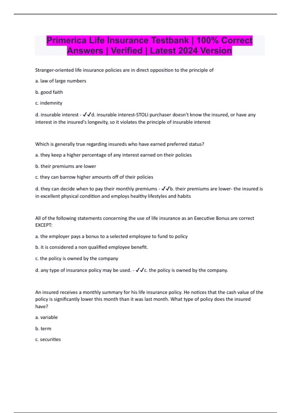 Stranger-oriented life insurance policies are in direct opposition to the principle of a. law of large numbers b. good faith c. indemnity d. insurable interest - d. insurable interest-STOLI purchaser doesn't know the insured, or have any interest in the insured's longevity, so it violates the principle of insurable interest Which is generally true regarding insureds who have earned preferred status? a. they keep a higher percentage of any interest earned on their policies b. their premiums are lower c. they can barrow higher amounts off of their policies d. they can decide when to pay their monthly premiums - b. their premiums are lower- the insured is in excellent physical condition and employs healthy lifestyles and habits All of the following statements concerning the use of life insurance as an Executive Bonus are correct EXCEPT: a. the employer pays a bonus to a selected employee to fund to policy b. it is considered a non qualified employee benefit. c. the policy is owned by the company d. any type of insurance policy may be used. - c. the policy is owned by the company. An insured receives a monthly summary for his life insurance policy. He notices that the cash value of the policy is significantly lower this month than it was last month. What type of policy does the insured have? a. variable b. term c. securities