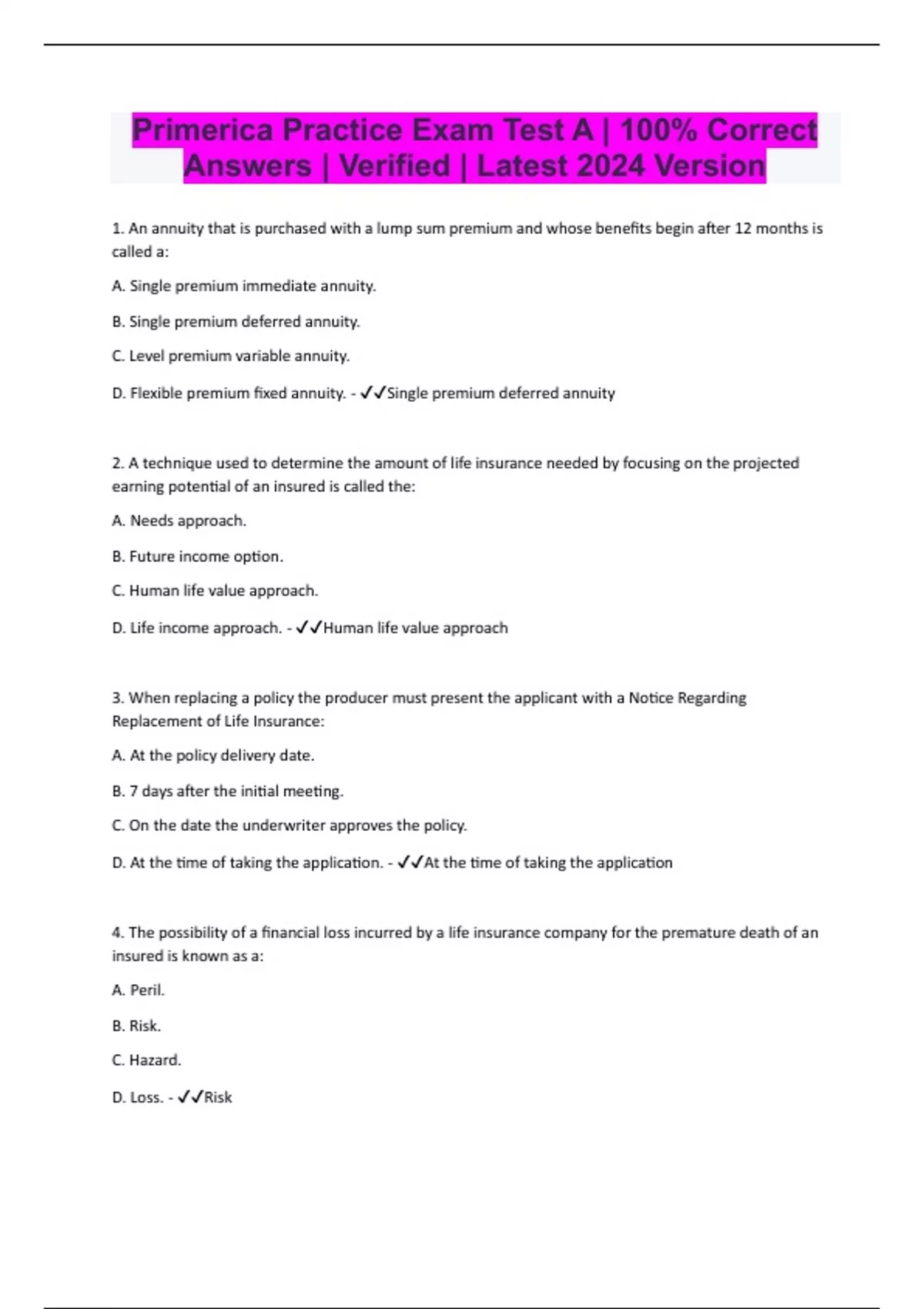 Primerica Practice Exam Test A | 100% Correct Answers | Verified | Latest 2024 Version
