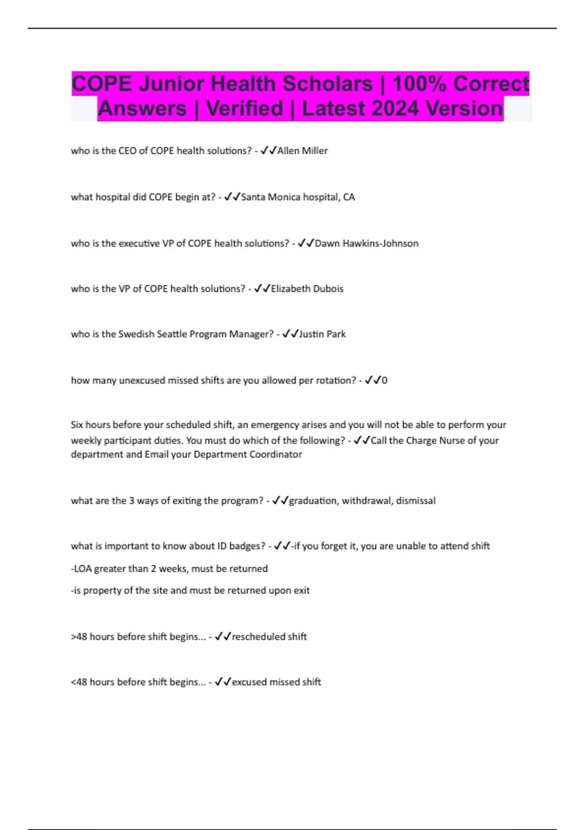 who is the CEO of COPE health solutions? - Allen Miller what hospital did COPE begin at? - Santa Monica hospital, CA who is the executive VP of COPE health solutions? - Dawn Hawkins-Johnson who is the VP of COPE health solutions? - Elizabeth Dubois who is the Swedish Seattle Program Manager? - Justin Park how many unexcused missed shifts are you allowed per rotation? - 0 Six hours before your scheduled shift, an emergency arises and you will not be able to perform your weekly participant duties. You must do which of the following? - Call the Charge Nurse of your department and Email your Department Coordinator what are the 3 ways of exiting the program? - graduation, withdrawal, dismissal what is important to know about ID badges? - -if you forget it, you are unable to attend shift -LOA greater than 2 weeks, must be returned -is property of the site and must be returned upon exit >48 hours before shift begins... - rescheduled shift <48 hours before shift begins... - excused missed shift