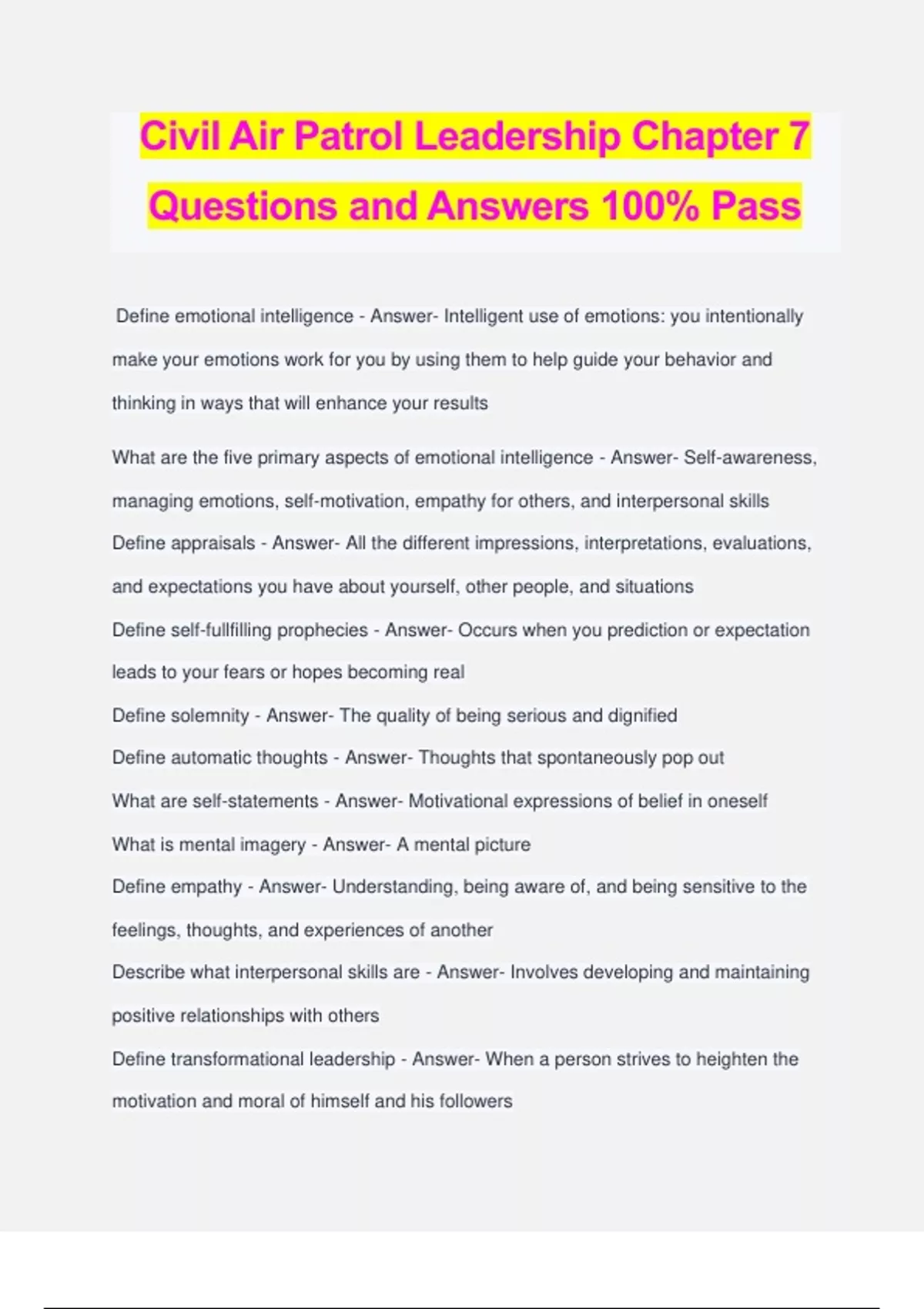 Civil Air Patrol Leadership Chapter 7 Questions and Answers 100% Pass Define emotional intelligence - Answer- Intelligent use of emotions: you intentionally make your emotions work for you by using them to help guide your behavior and thinking in ways that will enhance your results What are the five primary aspects of emotional intelligence - Answer- Self-awareness, managing emotions, self-motivation, empathy for others, and interpersonal skills Define appraisals - Answer- All the different impressions, interpretations, evaluations, and expectations you have about yourself, other people, and situations Define self-fullfilling prophecies - Answer- Occurs when you prediction or expectation leads to your fears or hopes becoming real Define solemnity - Answer- The quality of being serious and dignified Define automatic thoughts - Answer- Thoughts that spontaneously pop out What are self-statements - Answer- Motivational expressions of belief in oneself What is mental imagery - Answer- A mental picture Define empathy - Answer- Understanding, being aware of, and being sensitive to the feelings, thoughts, and experiences of another Describe what interpersonal skills are - Answer- Involves developing and maintaining positive relationships with others Define transformational leadership - Answer- When a person strives to heighten the motivation and moral of himself and his followers Define transactional leadership - Answer- An exchange that takes place between the leader and the follower What is idealized influence - Answer- Refers to the leader's principles and standards having the power to attract followers Define inspirational motivation - Answer- Leaders who communicate high expectations to followers, inspiring them to become committed to and a part of the shared vision in an organization Define individualized consideration - Answer- Describes leaders who are supportive of followers, listen closely to them, and acknowledge their unique needs